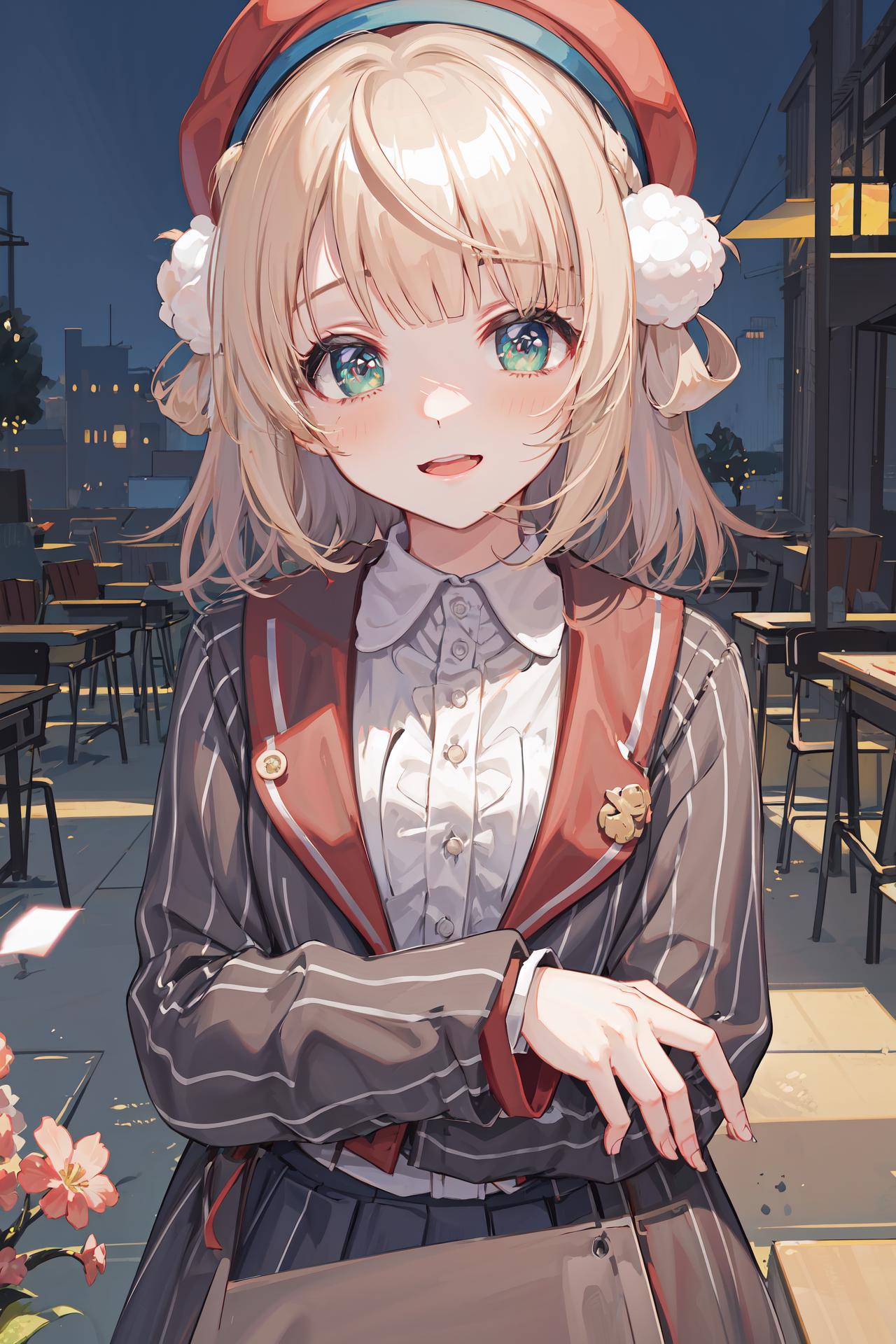 you don't have to describe her eye color or hair color unless you want something different. You can use red_beret, beret, pom_pom_necktie, striped_school_uniform, black_school_shoes to describe her 'official' costume.