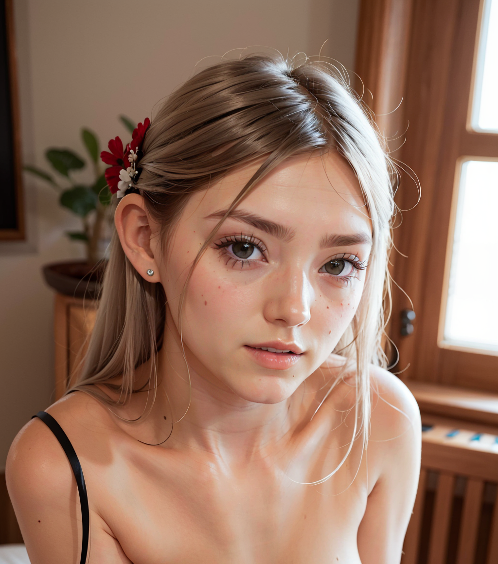 The pictures are a workaround for Civitai TOS. The pictures you get from the LoRa are usually much closer to what she usually wears.