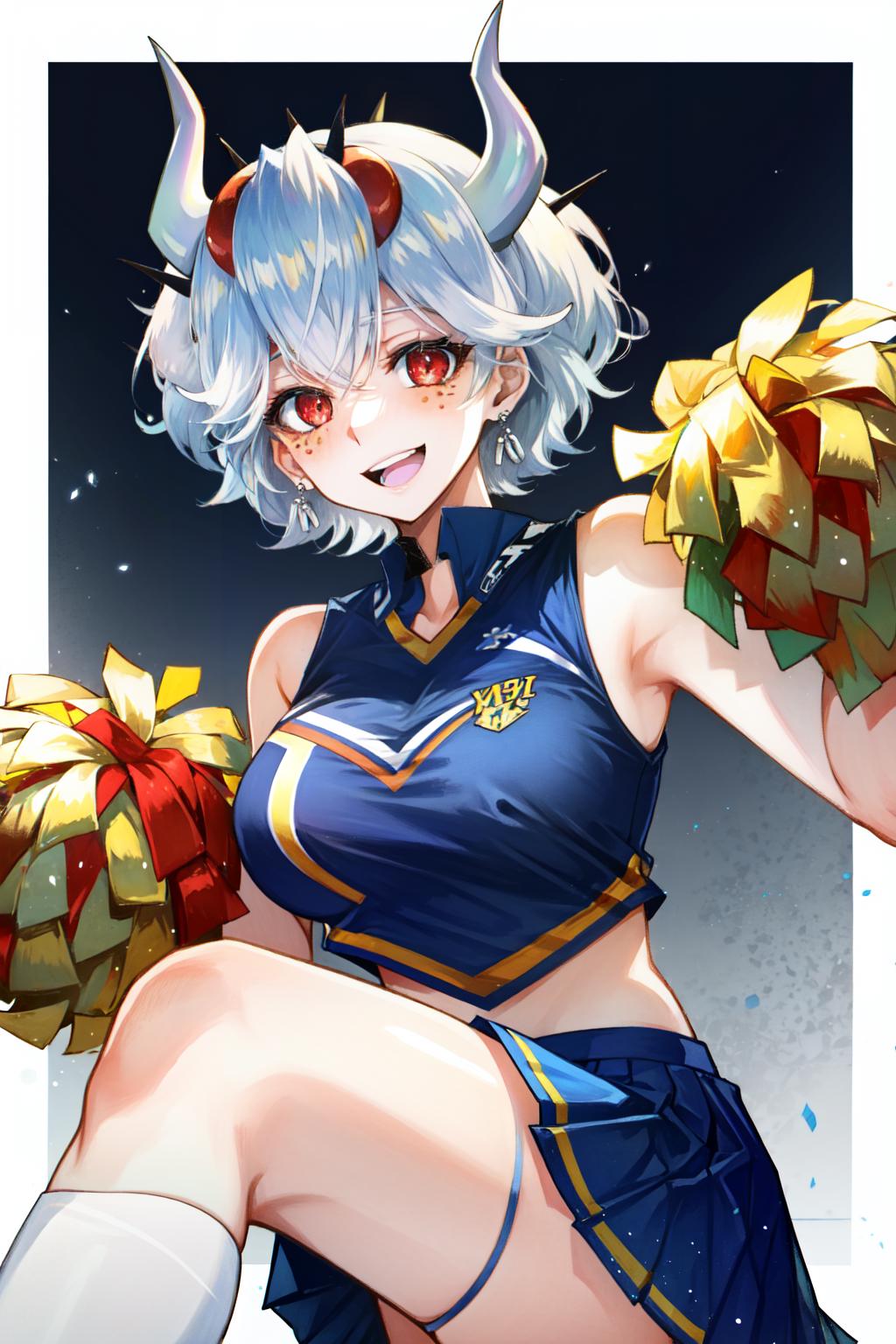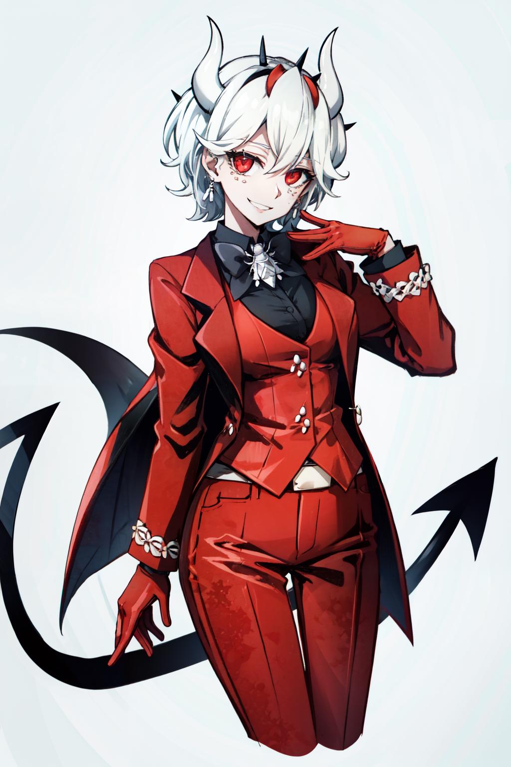 Use tags like : demon horns, demon girl,short hair, white hair, red suit