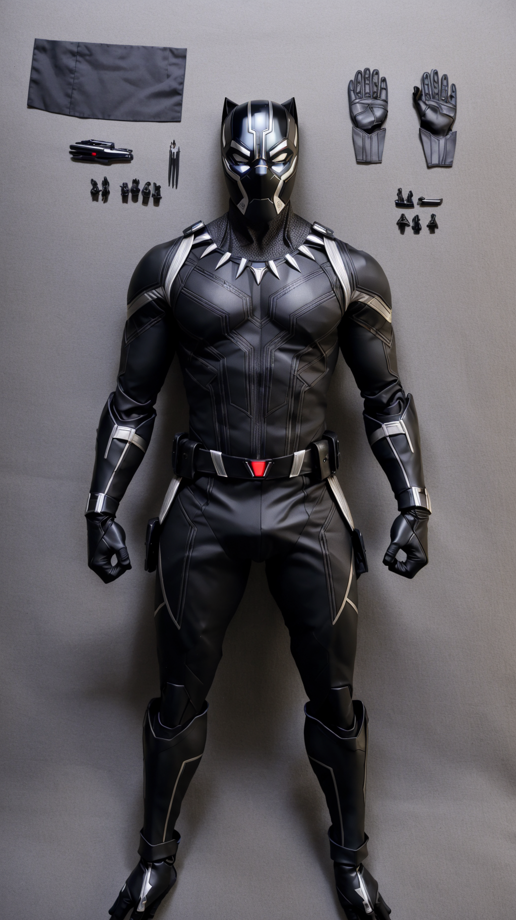 (best quality:1.15), (masterpiece:1.15), (detailed:1.15), (realistic:1.2),premium playset toy box, (8k, ultra quality, masterpiece:1.5), (Dutch angle:1.3), ActionFigureQuiron style, solo, Black Panther (Marvel Comics): Black Panther's sleek black suit is made of a vibranium-infused material and features intricate silver detailing. The suit includes a full-body jumpsuit, clawed gloves, and a mask with cat-like ears. , (plastic toy playset pack), inside gift box,<lora:quiron_ActionFigure_v2_Lora:0.95>