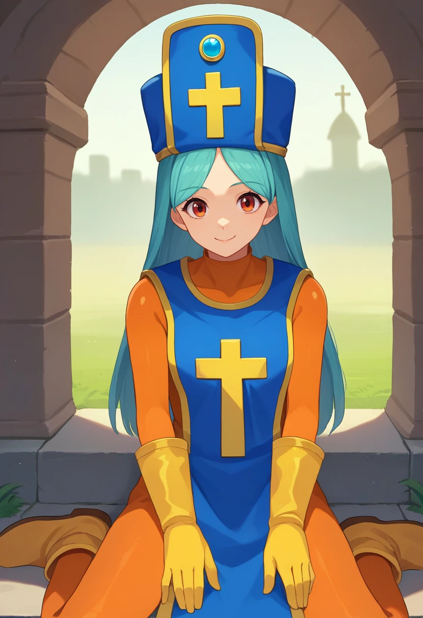 hat, orange bodysuit, tabard, cross, yellow gloves
