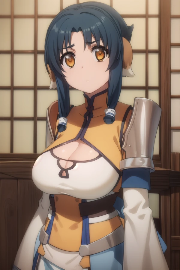 cleavage, cleavage cutout, long sleeves, wide sleeves, armor, shoulder armor,