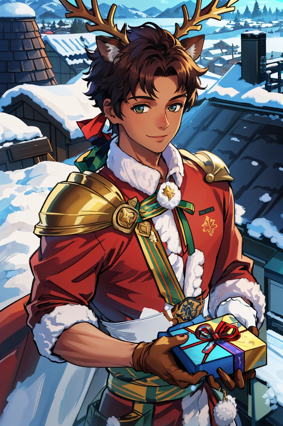 xmasClaude, gloves, animal ears, reindeer antlers, deer ears, boots, dark skin, cape, fur trim, bell, shoulder armor, santa costume