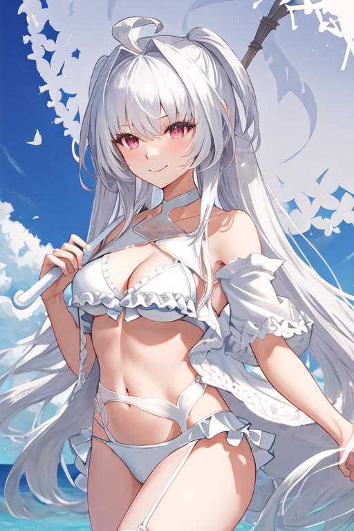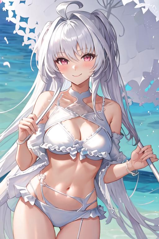 The trigger word is lady_avalon_fgo, and the recommended tags are best quality, masterpiece, highres, solo, {lady_avalon_fgo:1.15}, long_hair, white_hair, bangs, ahoge, ???????, smile, very_long_hair, swimsuit, white_bikini, purple_eyes, ??????????????, frilled_bikini, cleavage, umbrella, parasol, navel, red_eyes.