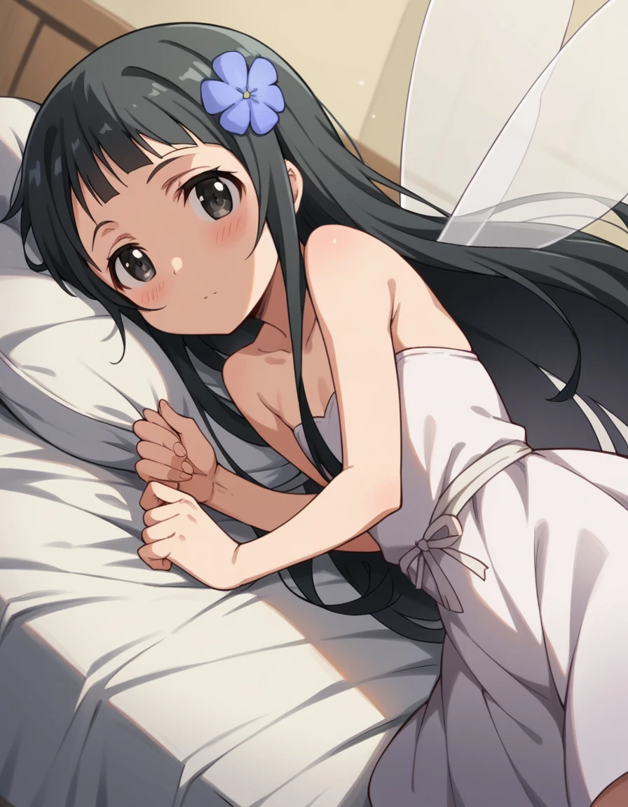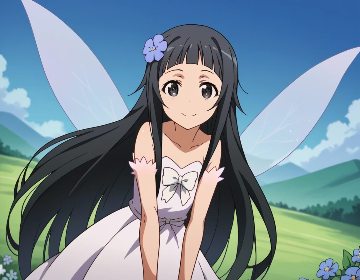 yui, long hair, bangs, black hair, hair ornament, very long hair, flower, hair flower, black eyes,