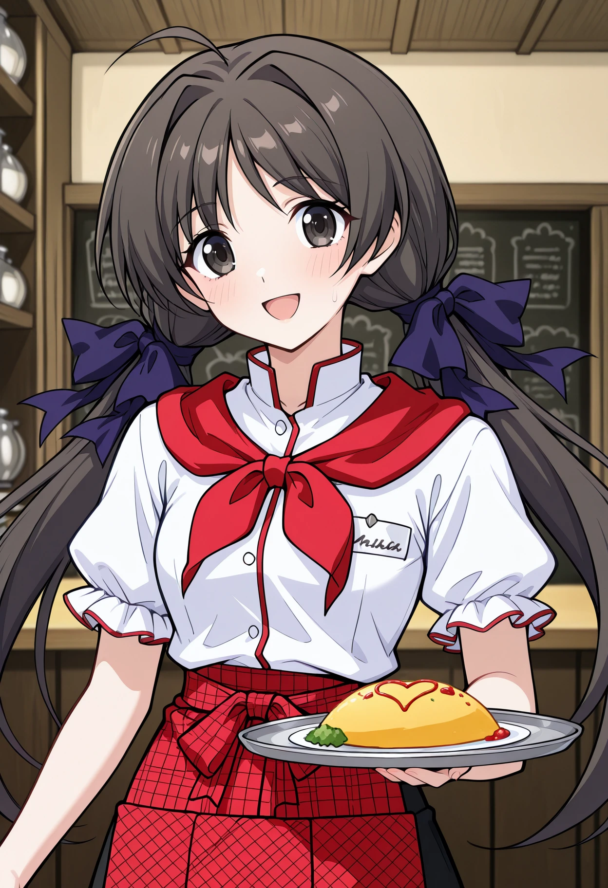 shirakawa hotaru \(memories off 2\), hotaruressac, low twintails, ahoge, purple hair ribbon, high collar, frilled sleeves,short sleeves, ressac uniform, red neckerchief, waist apron, red short apron, plaid apron, black skirt,