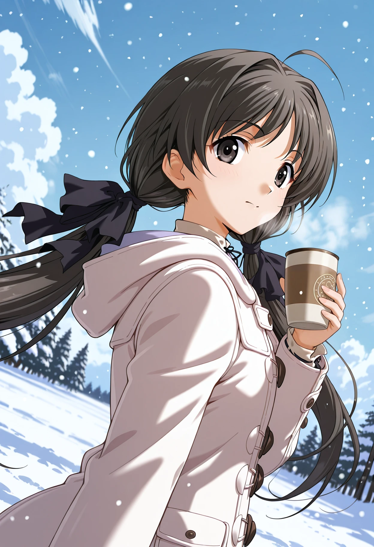shirakawa hotaru \(memories off 2\), hotarucoat, low twintails, ahoge, black hair ribbon, hooded coat, white duffel coat, white pocket, ribbon trim collar, mini plaid skirt, toggles, skirt under coat, black pantyhose,