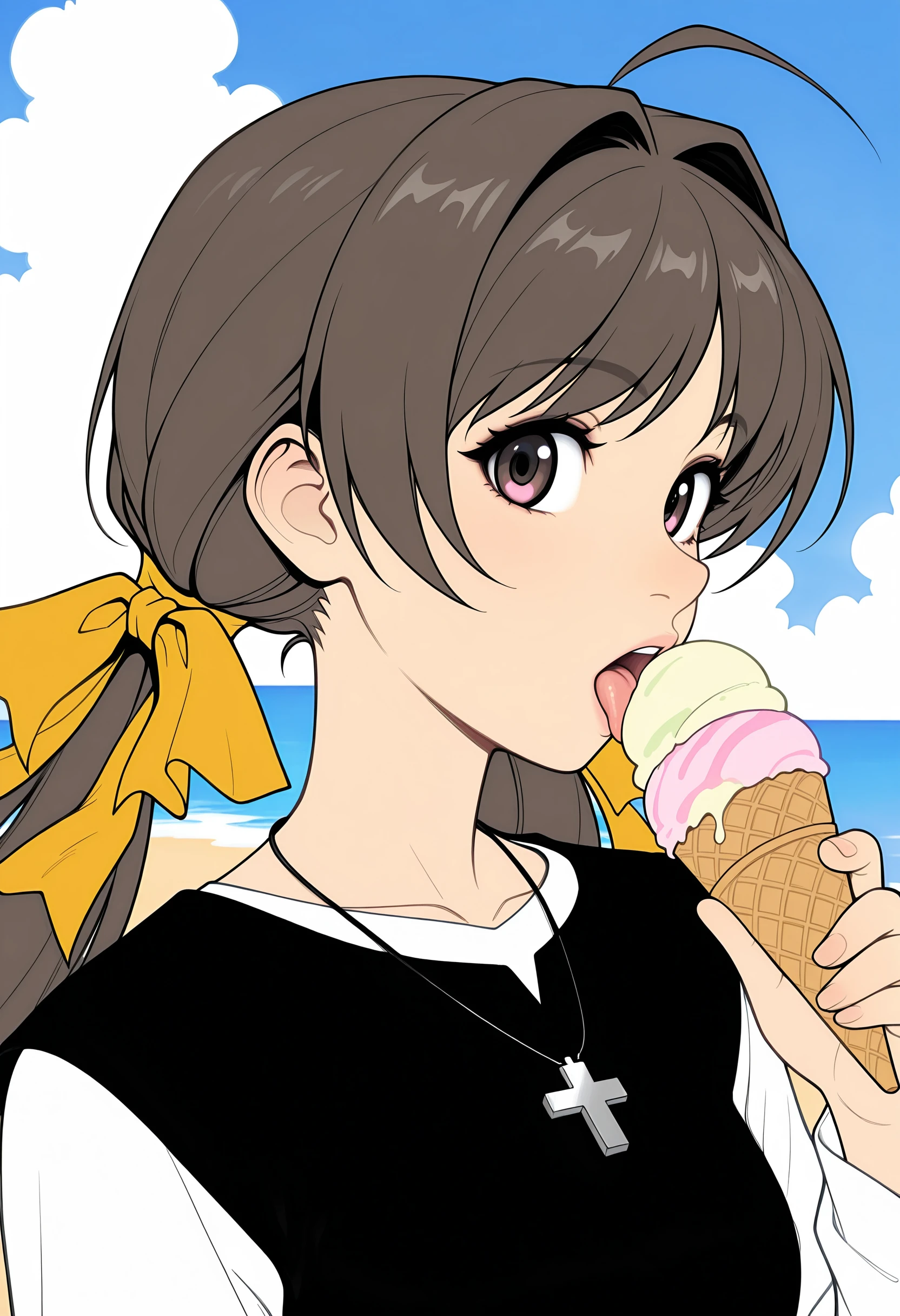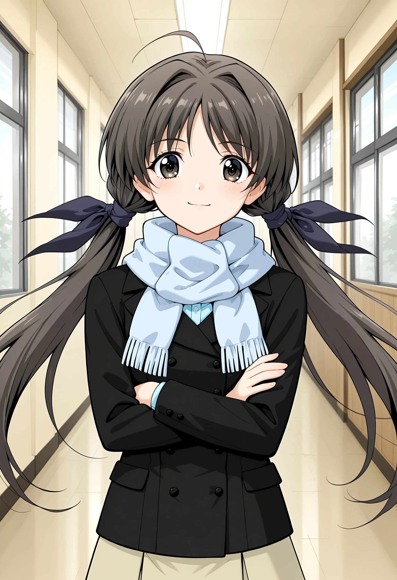 shirakawa hotaru \(memories off 2\), hotarujacket, low twintails, ahoge, unbuttoned, lace trim black jacket, black hair ribbon, white shirt, brown buttons on right, half sleeves, brown pleated skirt,????????????,