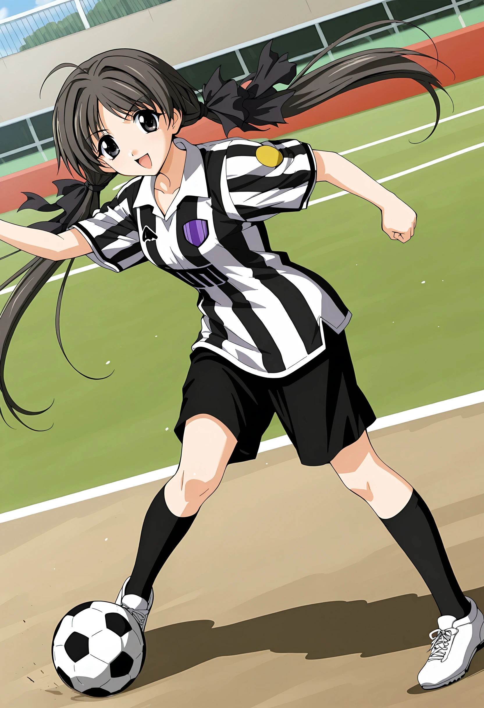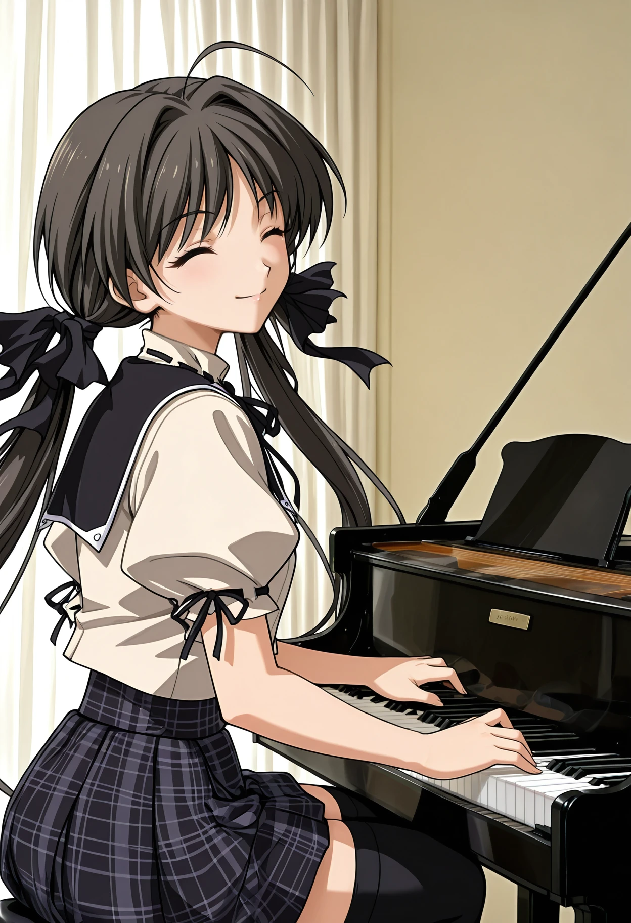 shirakawa hotaru \(memories off 2\), hotarulong, ahoge, low twintails, long hamasaki uniform, sailor collar, long sleeves, long topwear, diagonal stripes top, ribbon trim cuffs, black hair ribbon, black pantyhose, ribbon trim collar, half plaid skirt,