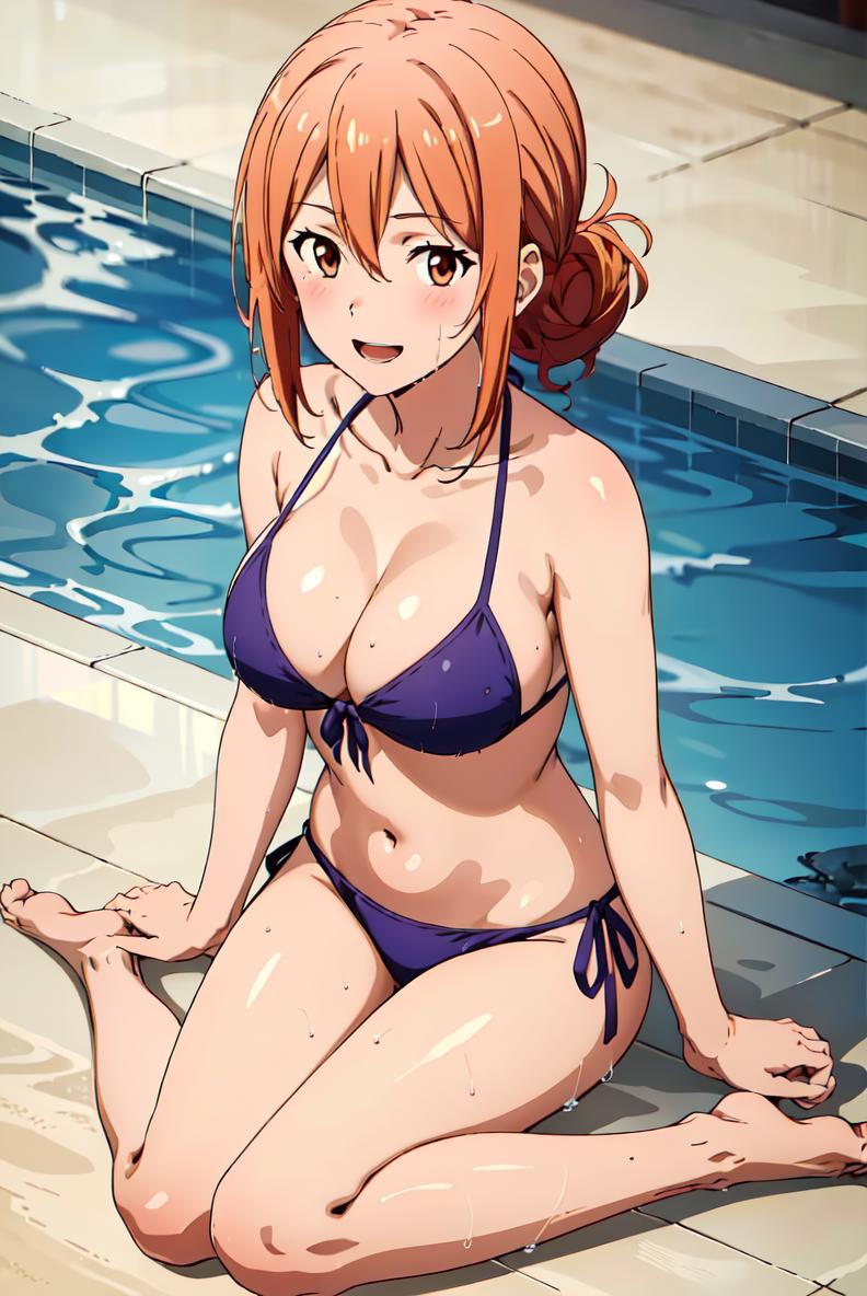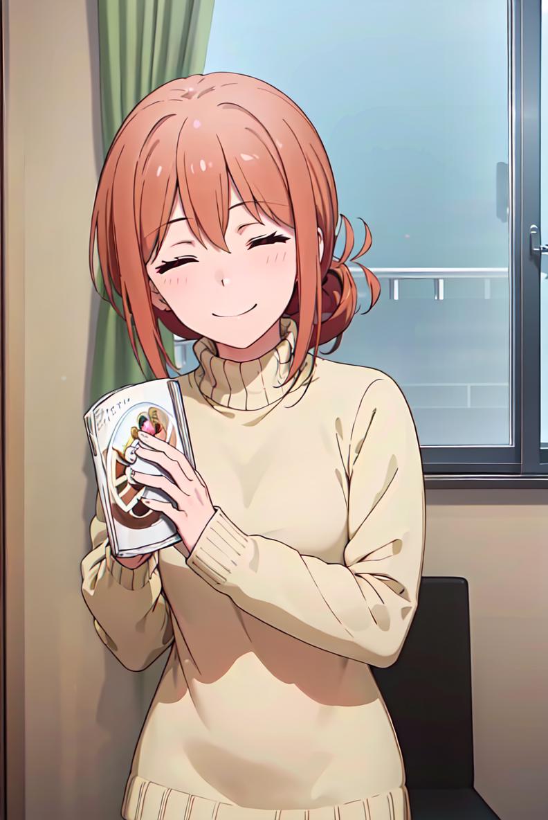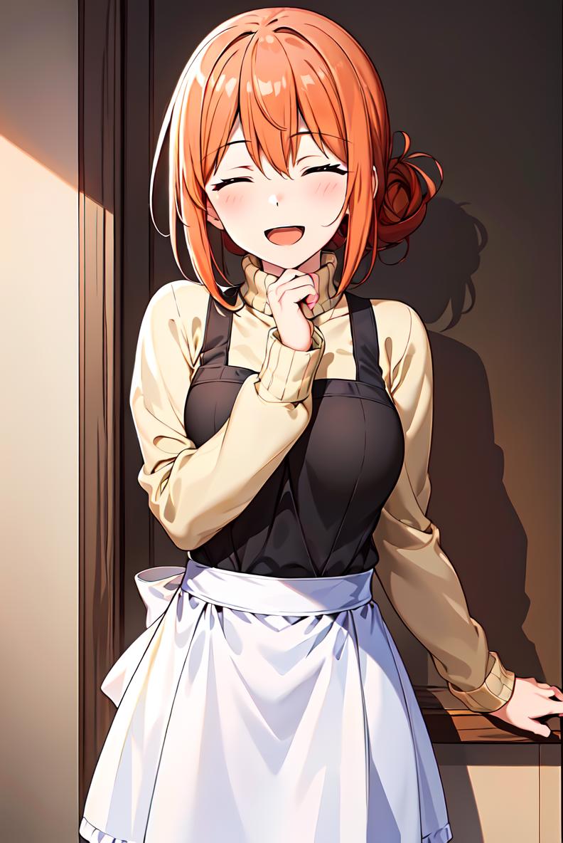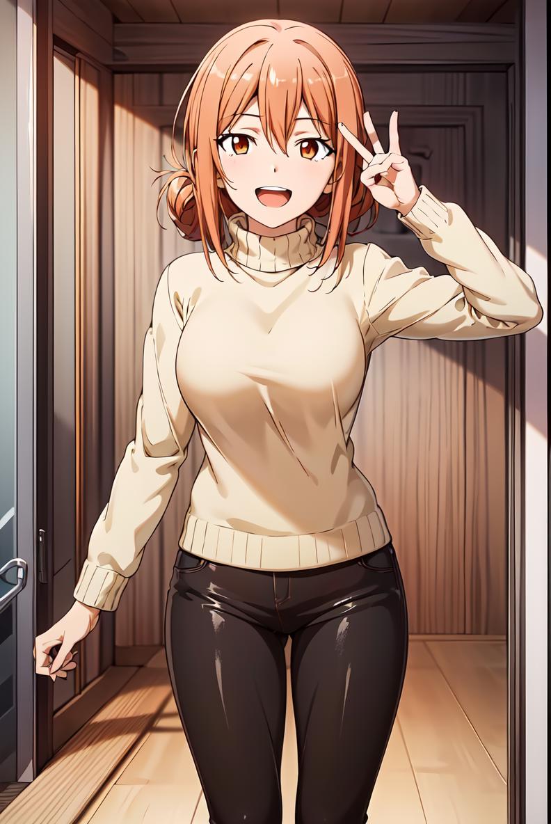 yuigahama, sweater, hair between eyes, turtleneck, orange hair, single hair bun, orange eyes, hair bun, long hair,