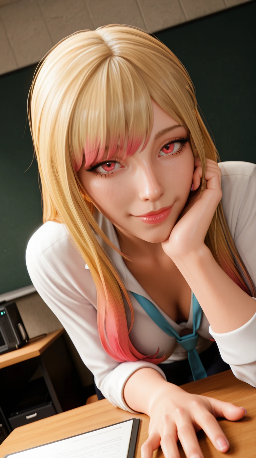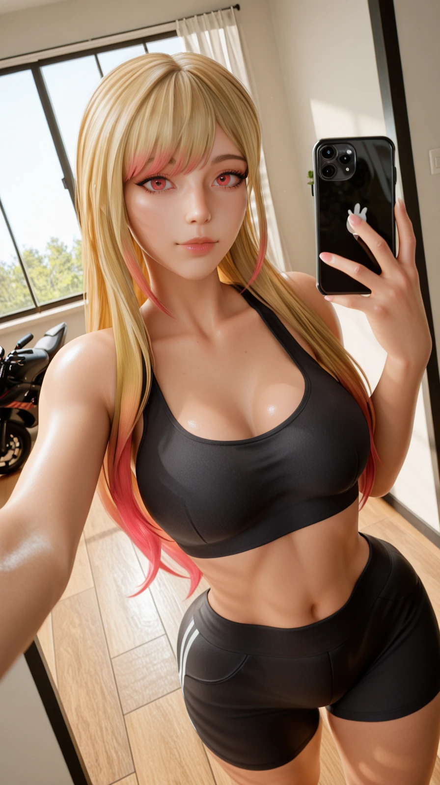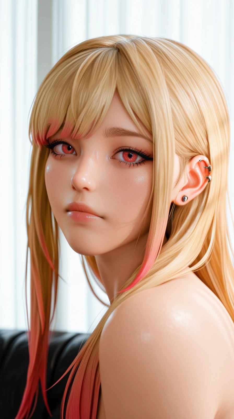 blonde hair, multicolured hair, gradient hair, coloured tips, red eyes, bangs