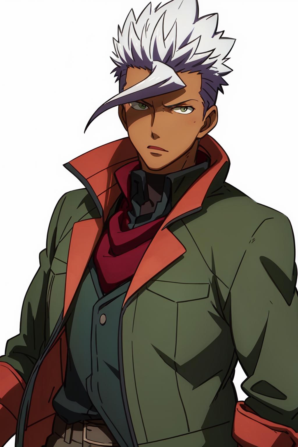 Season 1: orgas1, dark skin, white hair, spiked hair, military uniform, green jacket, red scarf