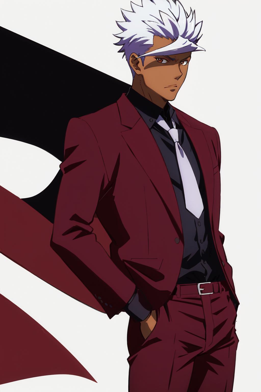 Season 2: orgas2, dark skin, white hair, spiked hair, suit, formal, necktie