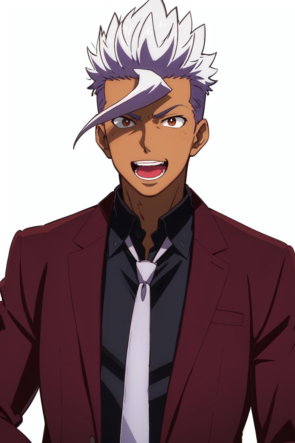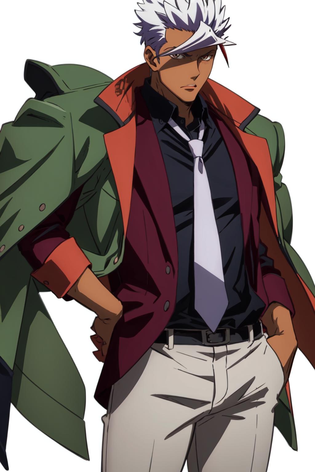 Season 2 (with green jacket): orgas2j, dark skin, white hair, spiked hair, jacket on shoulder, formal, suit, necktie