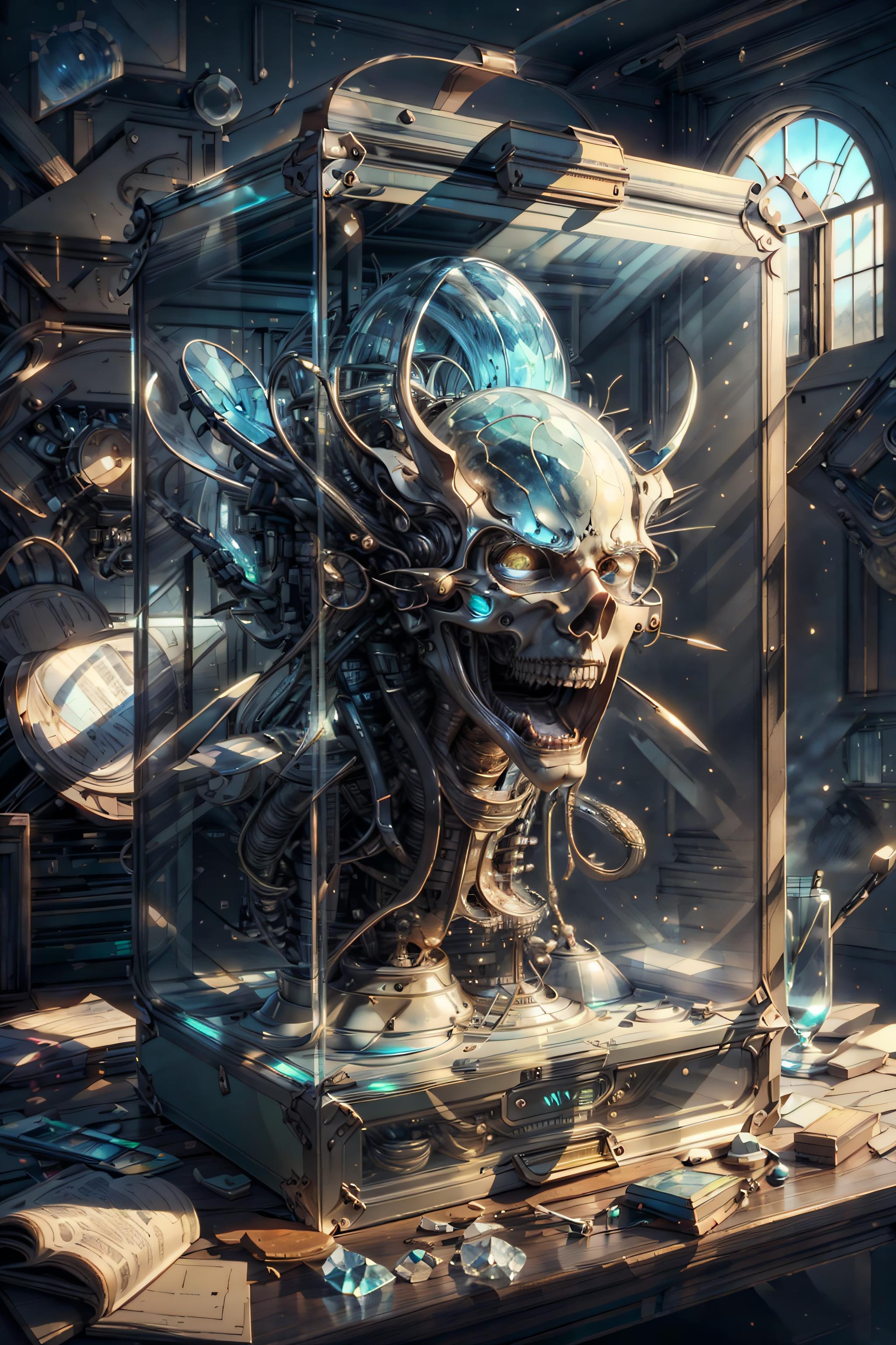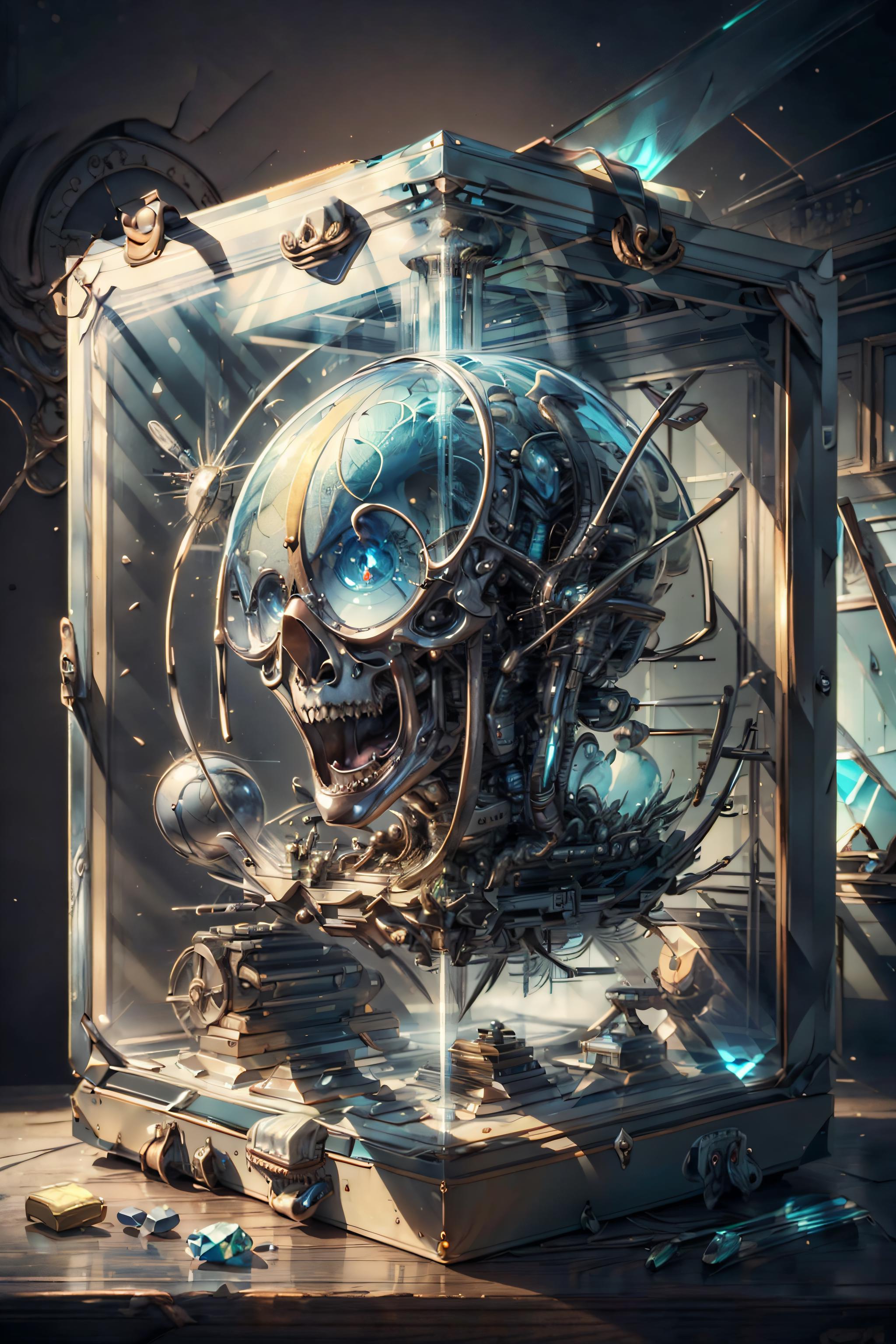 (KnollingCaseQuiron style), realistic, photorealism, photorealistic, reflections, refractions, octane render, isometic, glass case, display case, KnollingCase, no humans, scenery, still life, mirror, bowl, bottle, box, <lora:quiron_KnollingCase_v1_lora:0.47>