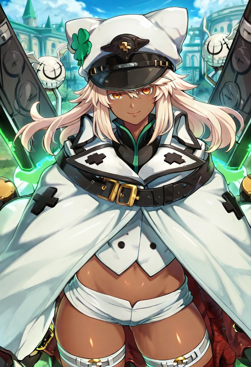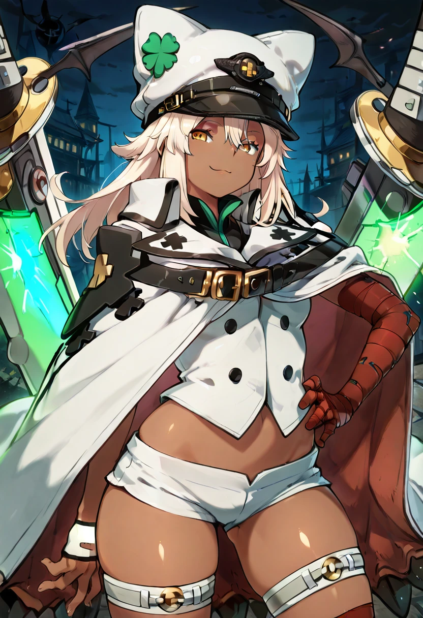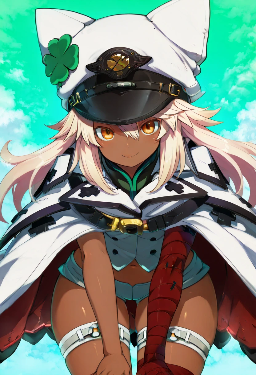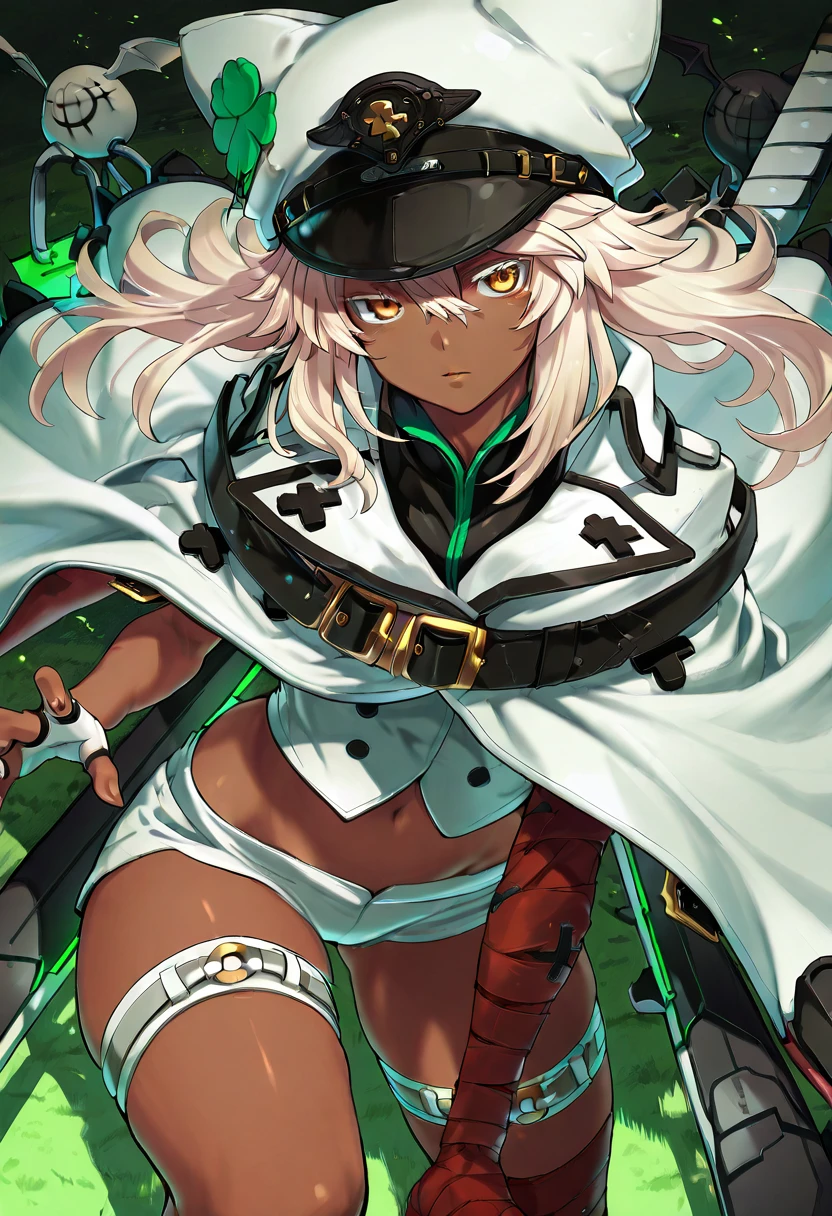 zzRamlethal, orange eyes, blonde hair, long hair, white hair, hat, cape, clover, four-leaf clover, shorts, thigh strap, yellow eyes, short shorts, bandages,