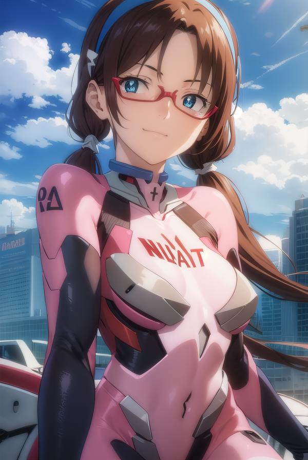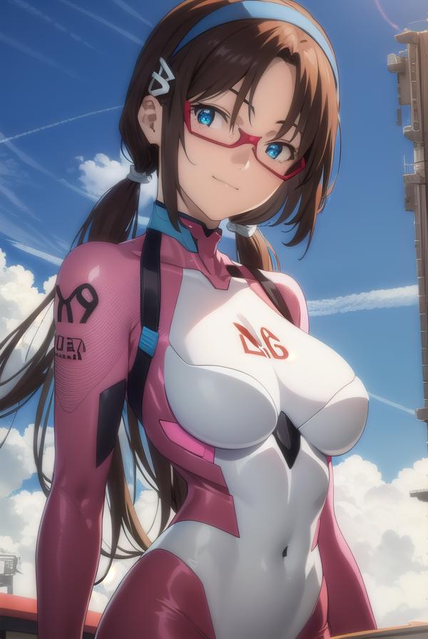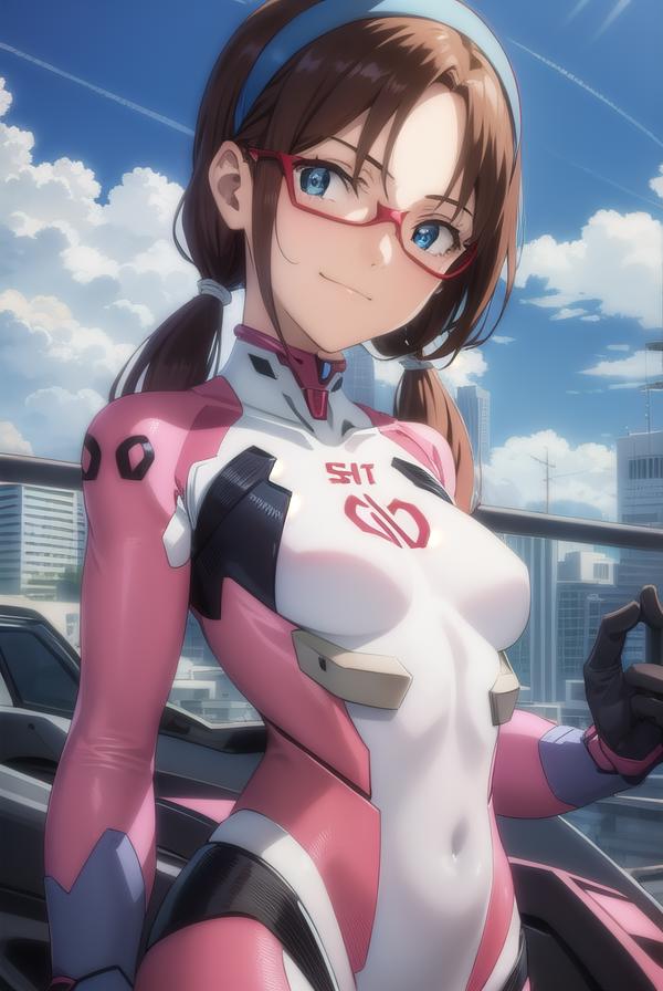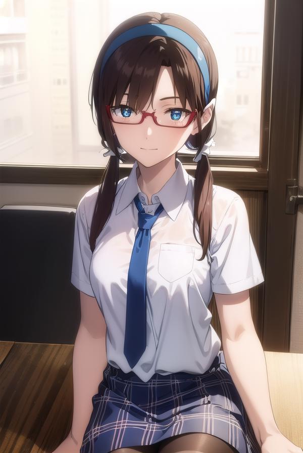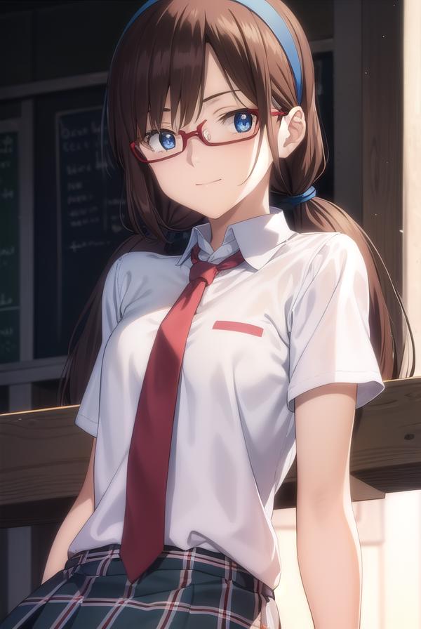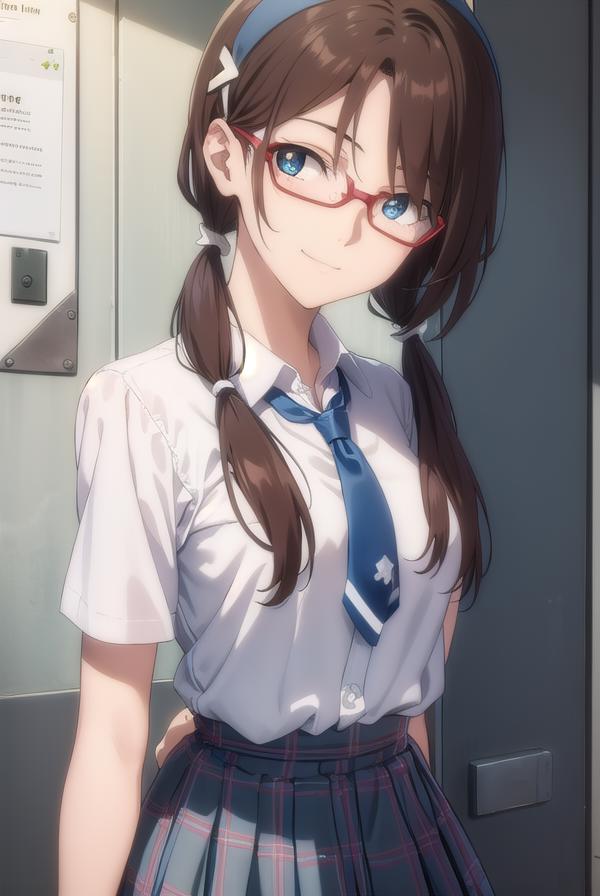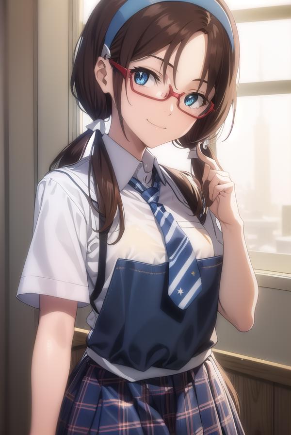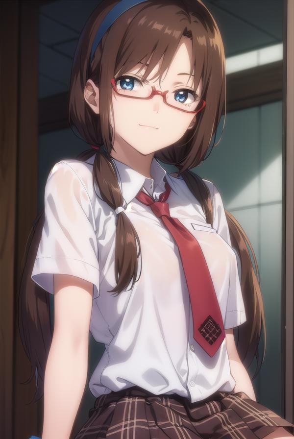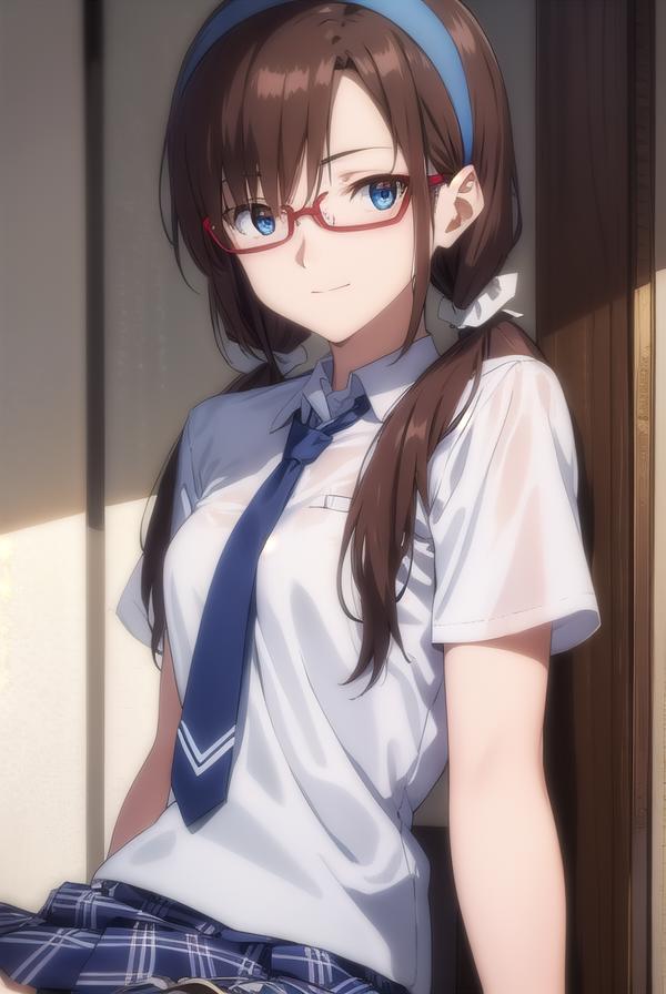 mari makinami, long hair, brown hair, twintails, (low twintails:1.5), hairband, blue hairband, blue eyes, (parted bangs:1.5),
