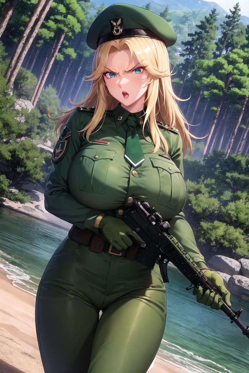 Normal costume: 1girl, mature female, blonde hair, blue eye, lipstick, makeup, green beret, green military, necktie, gloves, belt, pants
