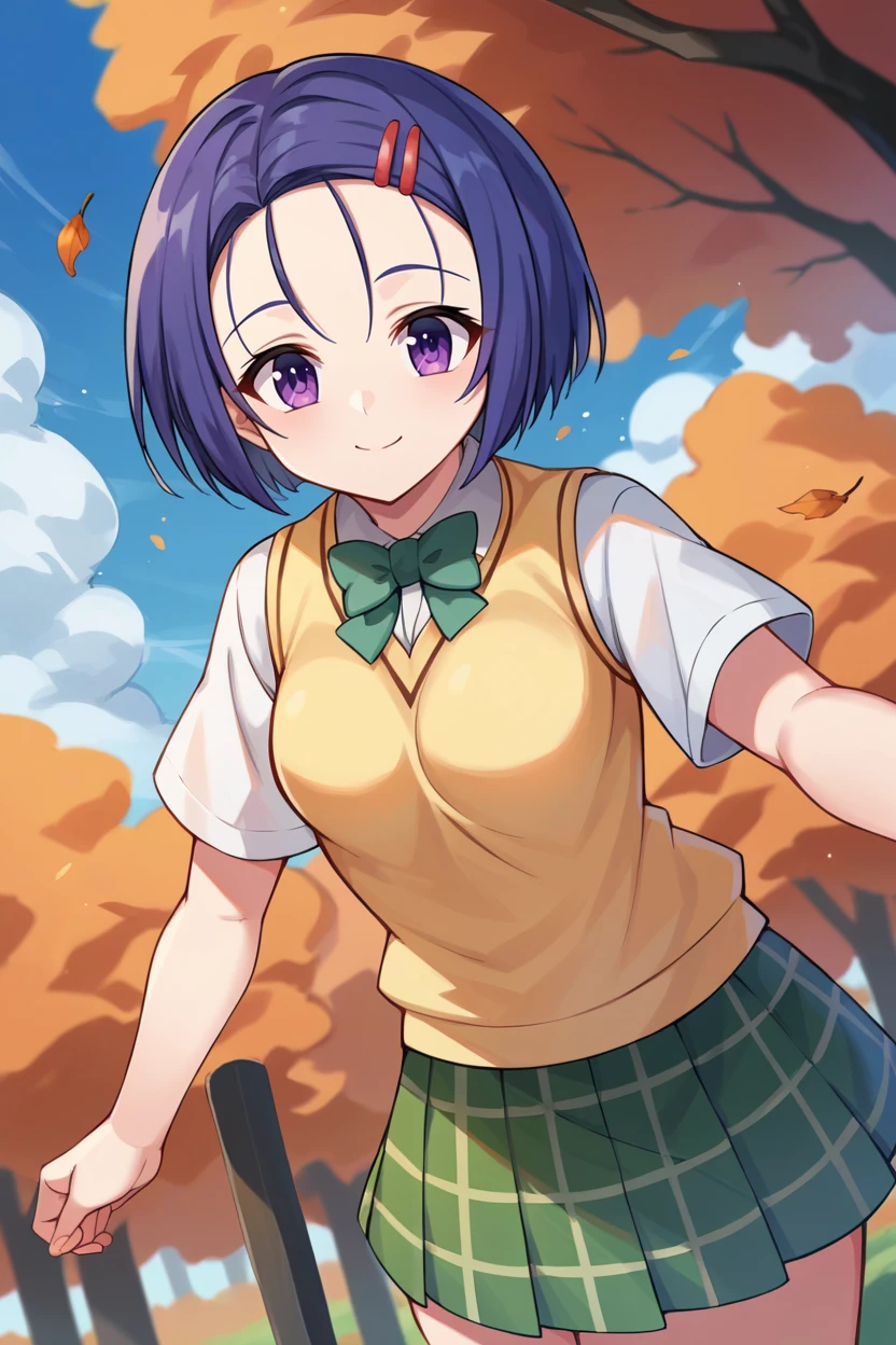 Add "hairclip, green bowtie, yellow sweater vest, white shirt, short sleeves, green miniskirt, plaid, short skirt" for her typical sweater vest.