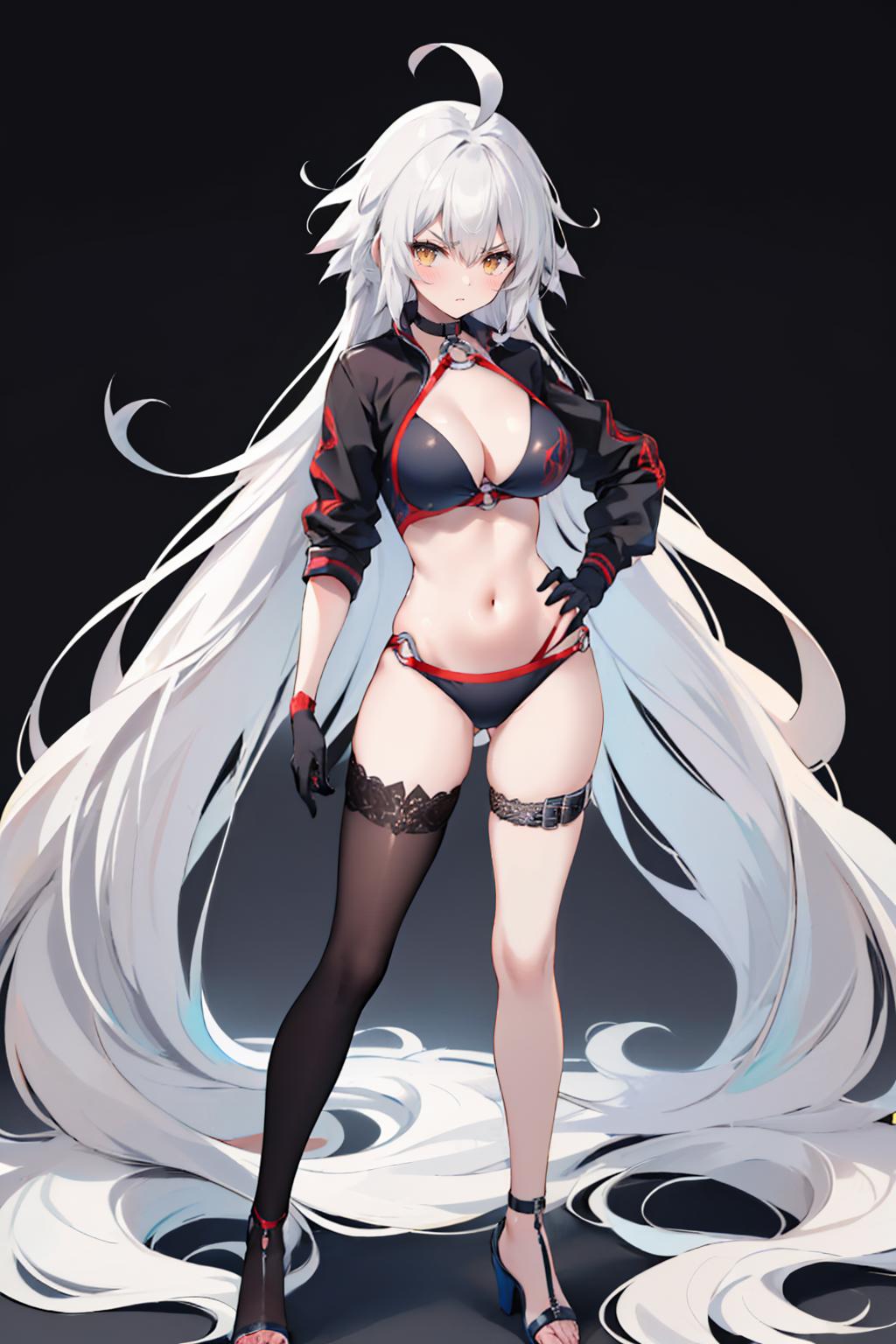 Default Outfit: jeannebrskr, ahoge, shrug \(clothing\), cropped jacket, o-ring ??????, black gloves, single thighhigh, thigh strap, choker