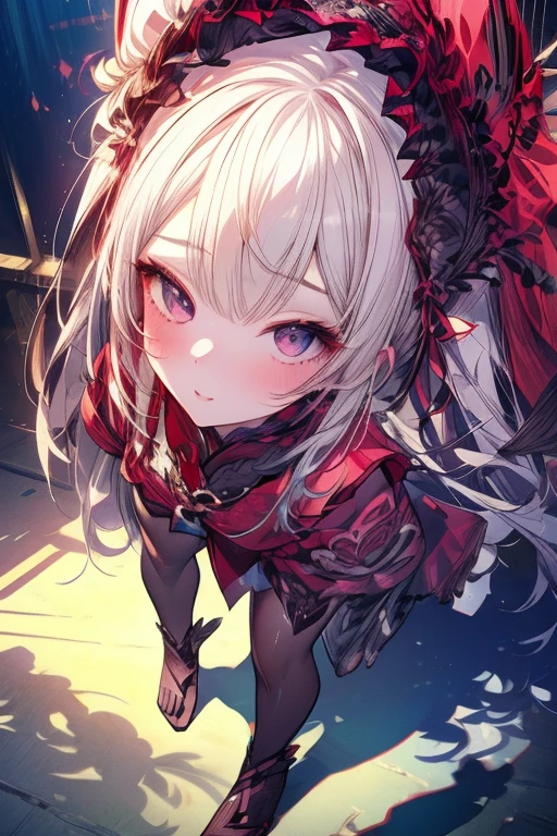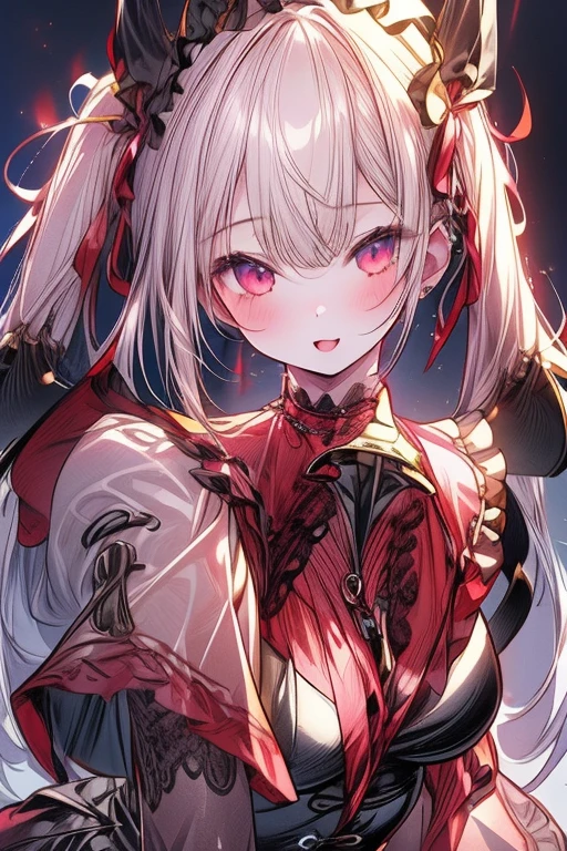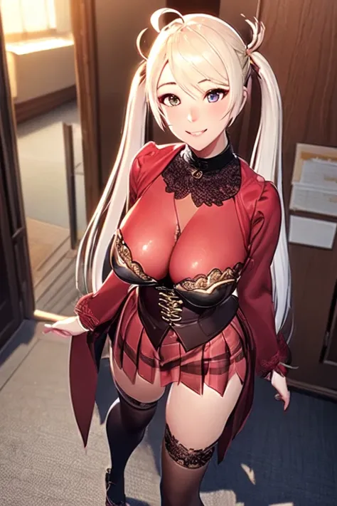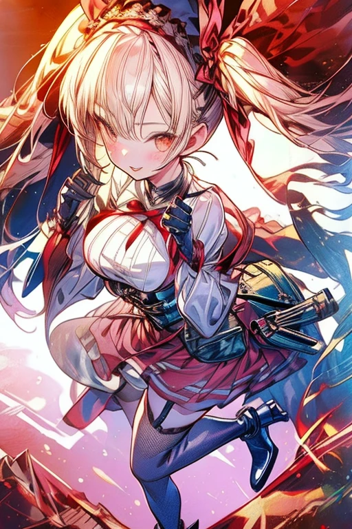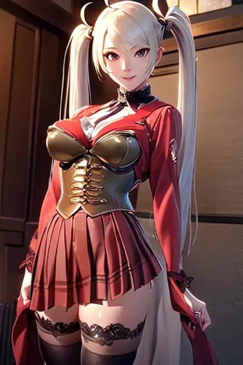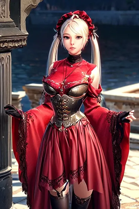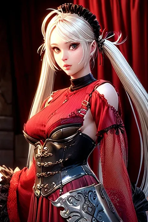 vinlynn,long hair,blond hair,twintails,age14,lips,red-brown eyes,ahoge,clothing cutout,hairband,boots,thighhighs,breasts,corset,red dress,wide sleeves,see-through,black footwear,gloves,high heels,fishnets,skirt,garter straps,armor,belt,pouch,