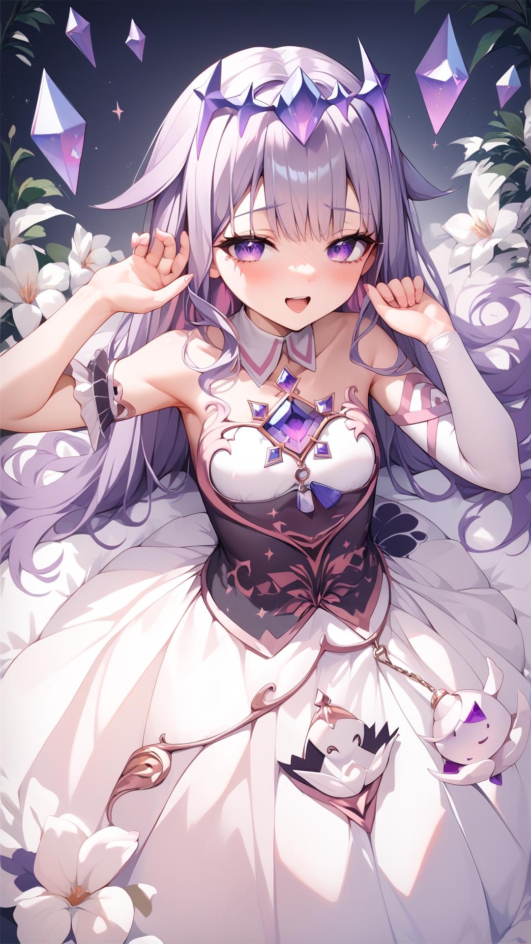 masterpiece, score_9, score_8_up, score_7_up, best quality, purple eyes, small , crown, White short dress, Koseki, One arm stocking,