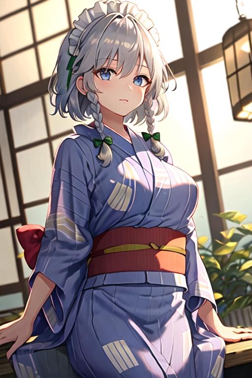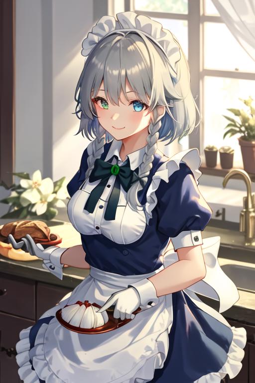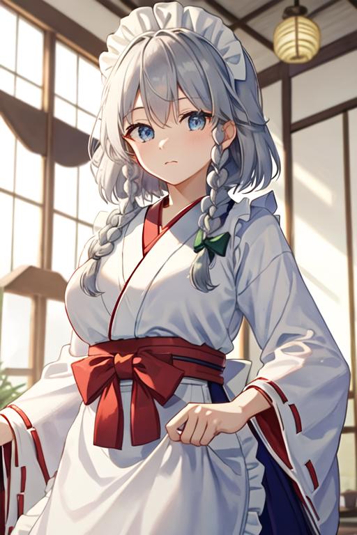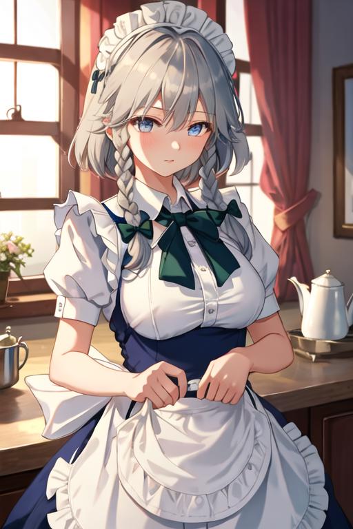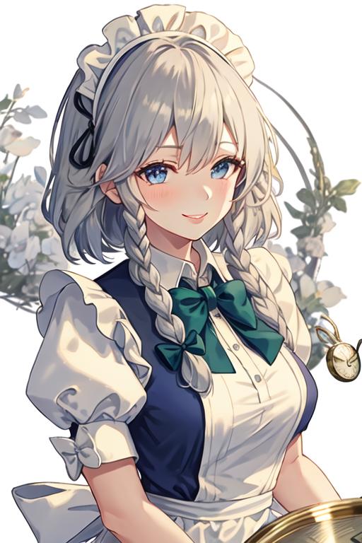 The trigger word is izayoi_sakuya_touhou, and the recommended tags are best quality, masterpiece, highres, solo, {izayoi_sakuya_touhou:1.15}, braid, twin_braids, maid_headdress, short_hair, bow, grey_hair, hair_bow, bangs, blue_eyes, ribbon, hair_between_eyes, ???????, apron, upper_body, green_bow, white_hair, red_eyes.