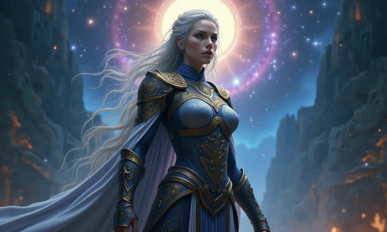 Lo sfondo è ultraterreno e drammatico , immersa in un bagliore cosmico che allude alla sua connessione con una forza maggiore . Una luce eterea brilla intorno a lei , che indicano sottilmente la sua padronanza sia del combattimento che della mente . La sua posizione è equilibrata e imponente , come se fosse pronta per la battaglia e a contemplare i misteri dell'esistenza .