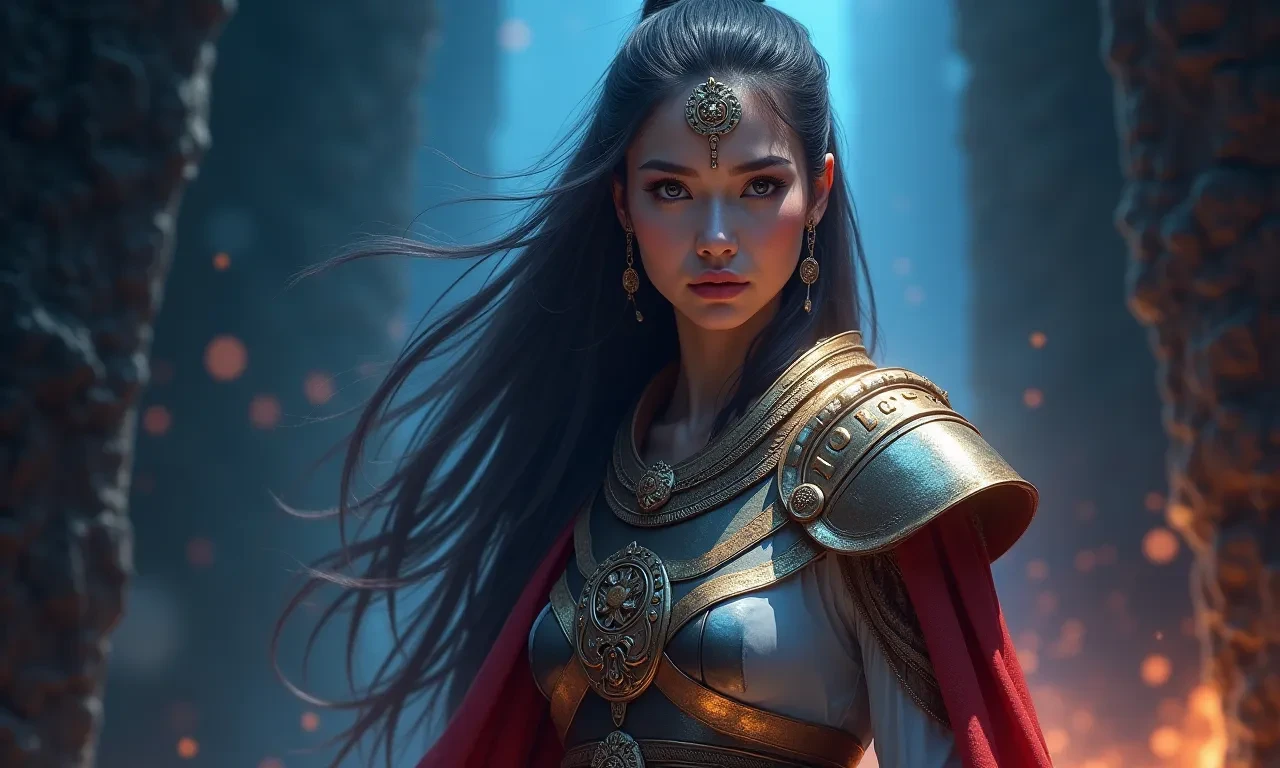 "Create a highly detailed and cinematografico portrait of a powerful and wise female warrior with an aura of authority and deep philosophical insight. Si erge alta e regale, che emanano un'aria di incrollabile fiducia ed esperienza , come se vedesse oltre il tempo e il pensiero . Il suo sguardo penetrante riflette la conoscenza di innumerevoli battaglie e la saggezza dei secoli , che incarna l'essenza sia di una protettrice che di una saggia .