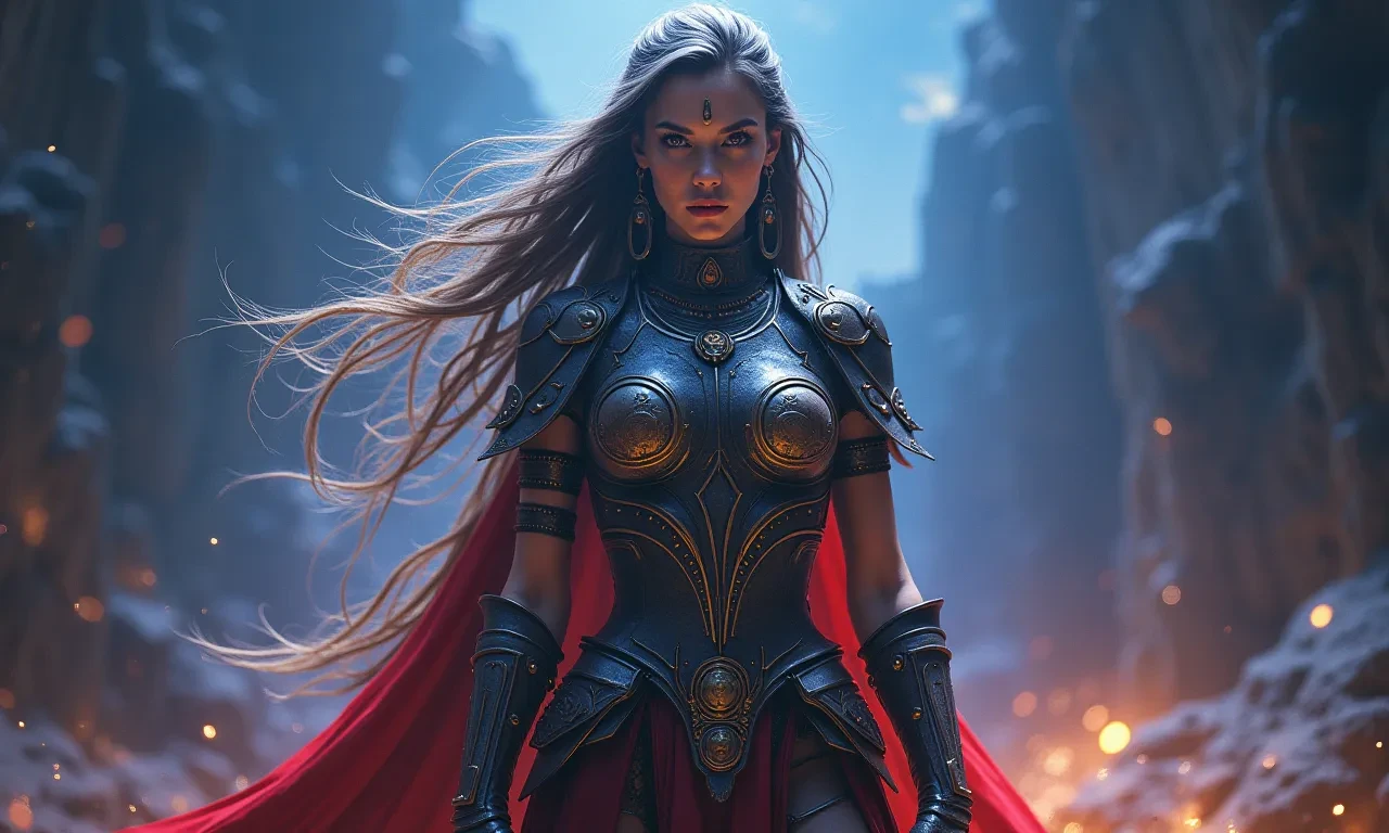 Create a highly detailed and cinematografico portrait of a powerful and wise female warrior with long, flowing black hair, sottilmente illuminati da striature di riflessi rossi e ramati . Il suo sguardo penetrante trasmette sia profonda saggezza che il peso di innumerevoli battaglie , come se comprendesse il passato , PRESENTE, e futuro allo stesso tempo .
