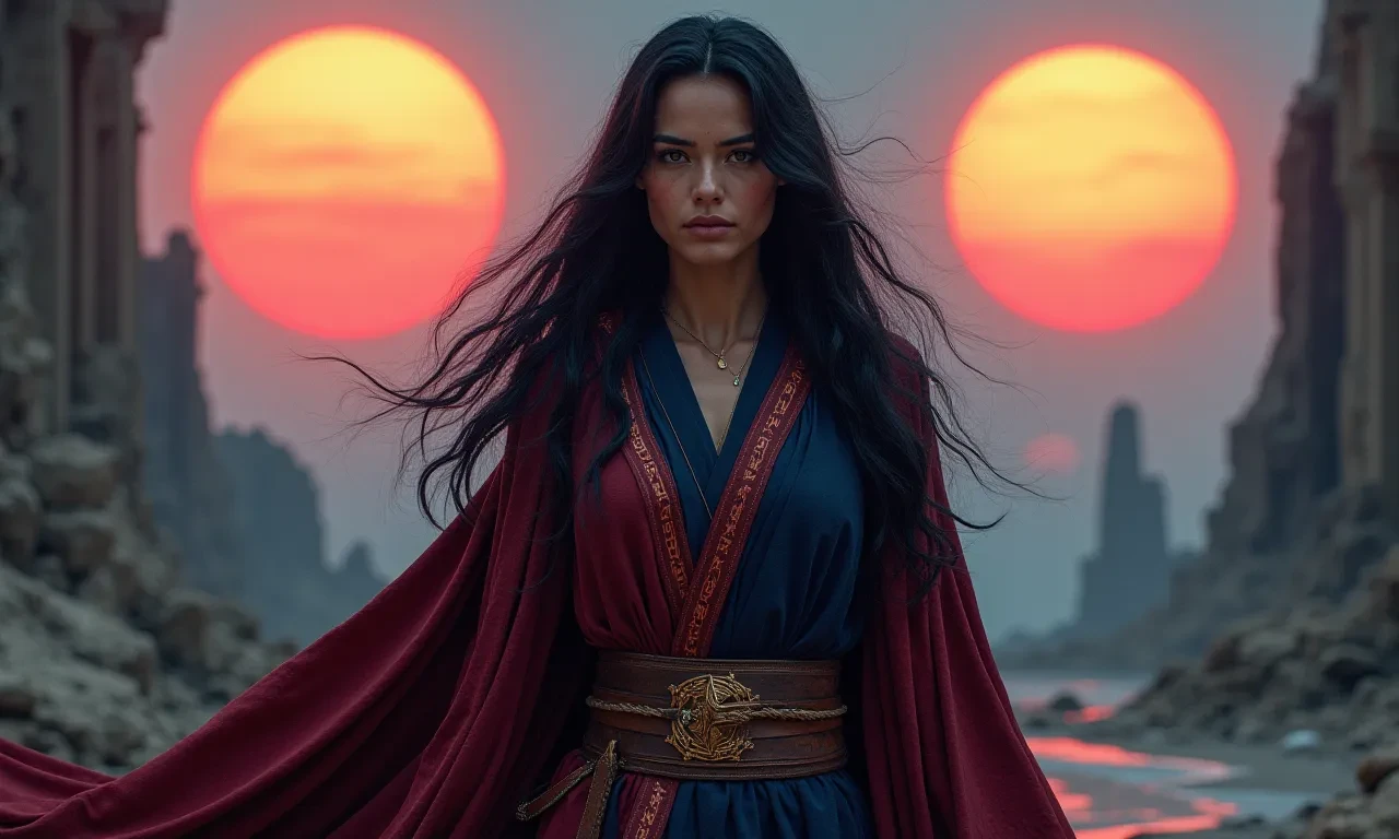 Lo sfondo è un'espansione cosmica, un tempio celeste , o un campo di battaglia in rovina sotto due soli gemelli , che rafforza la sua presenza leggendaria . L'illuminazione drammatica migliora la profondità e la consistenza della scena , } proiettando ombre che alludono alla saggezza e ai misteri di cui è portatrice . L'atmosfera trasuda misticismo e potere , fondendo l'estetica della conoscenza antica e l'energia futuristica .