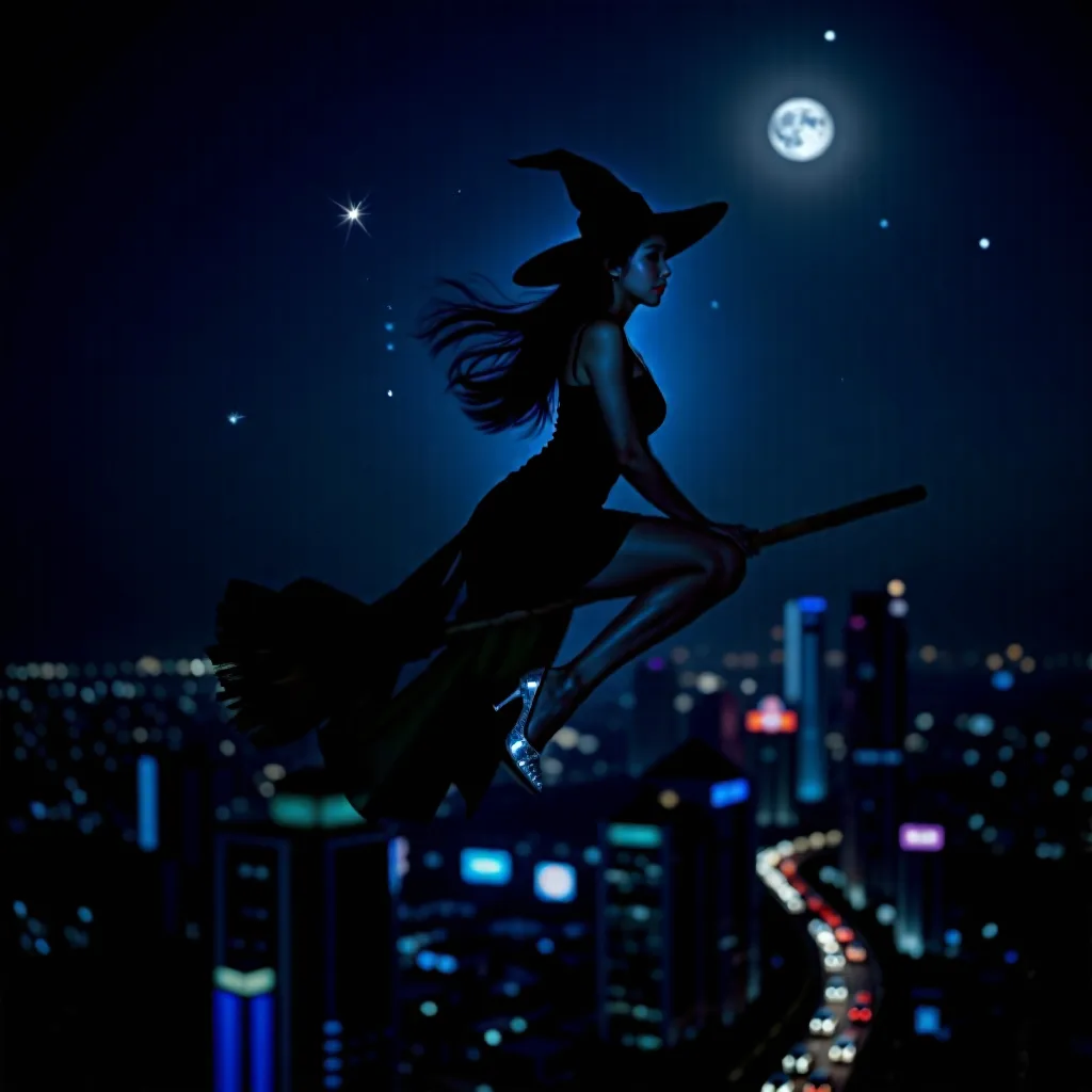 Una misteriosa strega asiatica sta volando su una scopa magica sopra una metropoli notturna. I suoi lussuosi capelli neri, che arrivano fino alle ginocchia, svolazzano nel vento ad alta quota, creando un alone mistico. Il suo viso delicato, con le sue caratteristiche orientali, naso piccolo, e grandi occhi castani , è illuminata da un sorriso misterioso. Il suo corpo snello, con la sua vita sottile e il suo seno prosperoso, è avvolta in un abito nero, abito mini aderente che accentua ogni curva. I suoi tacchi a spillo tempestati di cristalli scintillano nel riflesso delle luci della città. Below, una metropoli futuristica si estende: Grattacieli, insegne al neon , e flussi di auto. Scintille di magia vorticano intorno alla strega, riflesso nelle facciate di vetro degli edifici. Il cielo notturno è costellato di stelle, e la luna piena crea un bagliore d'argento mistico.