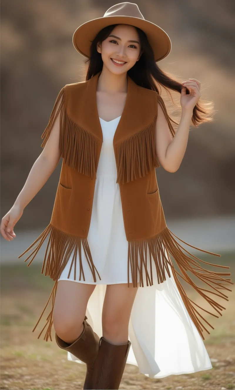 Immergetevi nel selvaggio West con un gilet in camoscio frangiato sopra un abito bianco e fresco. Gli stivali alla caviglia danno solidità al tuo look, mentre un cappello a tesa larga incorona il tuo stile senza sforzo. Cattura lo spirito dell'avventura con ogni ondeggiare delle frange e ogni passo sotto il cielo aperto.