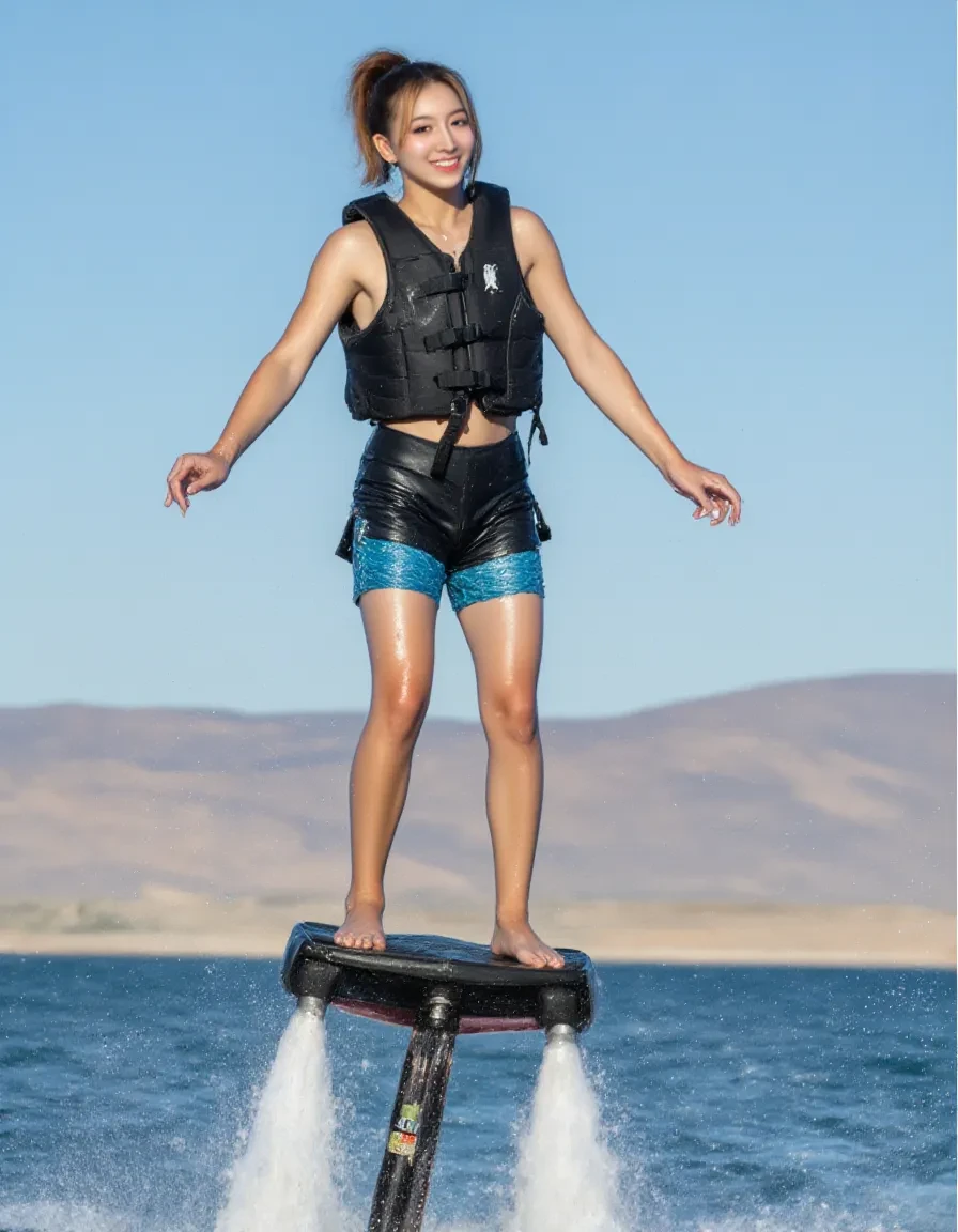 Una persona sta in piedi saldamente su un flyboard mentre forti getti d'acqua sparano dritti verso il basso, braccia rilassate, sicuro e bilanciato sotto il cielo estivo luminoso.