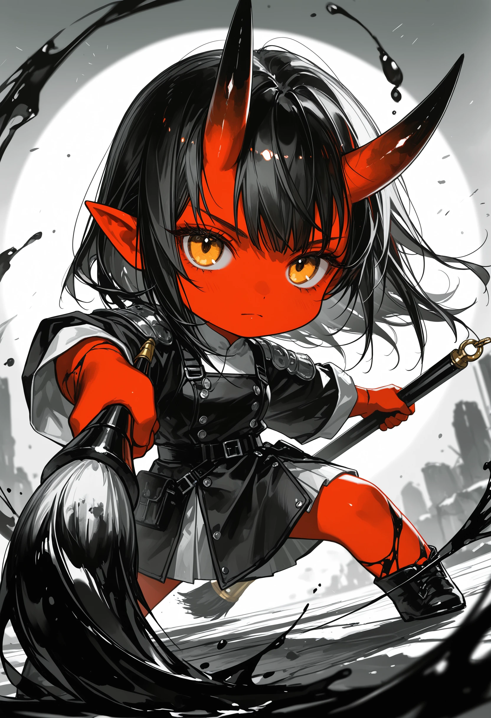 (masterpiece:1.2, Best Quality), (finely detailed beautiful eye: 1.2), (beautiful detailed face, good_hands), expressionless, different poses, lifeless eyes, tired, upper body, portrait, action pose, holding scythe, black scythe, scythe with dark purple edge, dynamic angle, dark red hair,swept bangs, low twin tails, gray eyes, strapless gray shirt, white frill trim, black trousers, black combat boots, tattered black cloak, willow tree branches, dark background, lantern, small , thin, (color guide:1.2), (multiple views), (full body), dynamic pose,dramatic composition with ink splatter effects, manga style with explosive effect,dramatic lighting, dark purple splash effect,