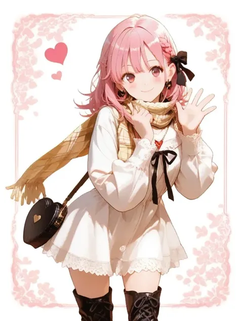pink hair,  Braided Hair,Sophisticated Nanyan,Gentle red eyes, smooth and soft skin,  red plaid scarf , Background,(masterpiece, Highest Quality:1.2),  cute white teddy bear,anime style, cinematic lighting, autumn sunset, pink-haired girl “Iroha” with soft wavy shoulder-length hair tied with a black ribbon, gentle red eyes, wearing a white cloak and black inner dress, holding a white teddy bear “Yuri” with red ribbon around its neck and small button eyes. She stands on a rocky cliff above a glowing golden valley, holding a ceremonial silver sword reflecting sunset light. maple leaves fluttering, soft wind, atmosphere of melancholy and hope, painterly style, high detail, warm golden tone.