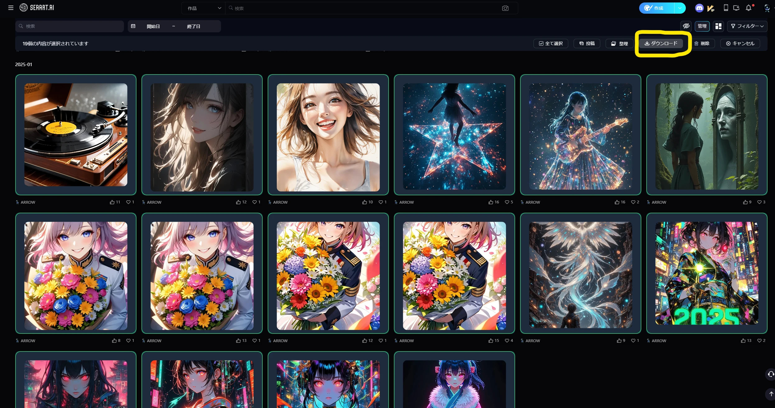 もちろん生成作品のダウンロードも可能ですが、こちらは無料会員と有料会員で一括ダウンロード機能の有無など、使用できる機能が変わってきます。