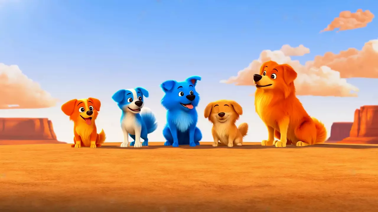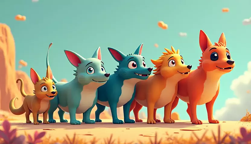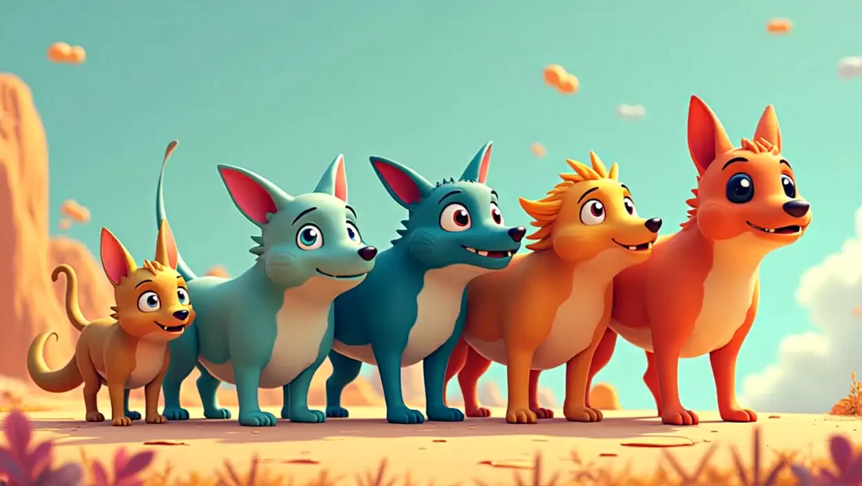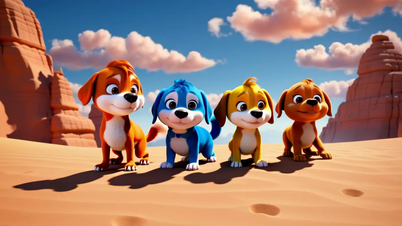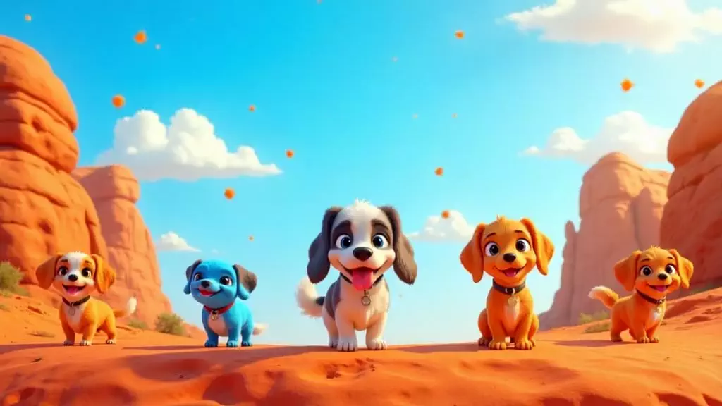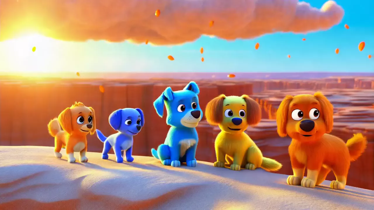 使用したプロンプトは[High-quality, cheerful and lively 3D animation (Disney or Pixar style) with exaggerated movements. Five colorful anthro dogs stand in a line on a sun-drenched desert cliff. The sky is bright blue with fluffy orange clouds floating lazily. Beyond, orange rock formations rise. Sunlight creates warm tones and natural shadows across the sandy ground.