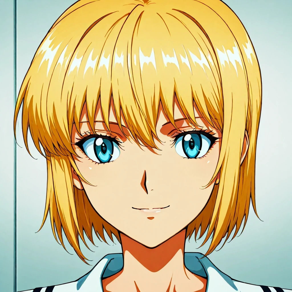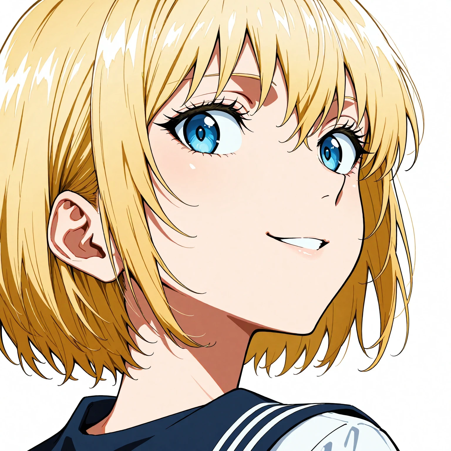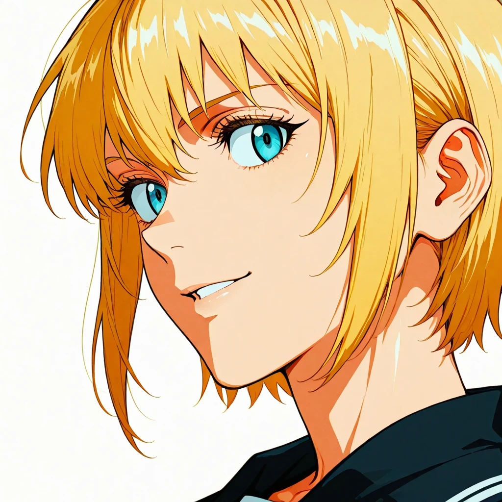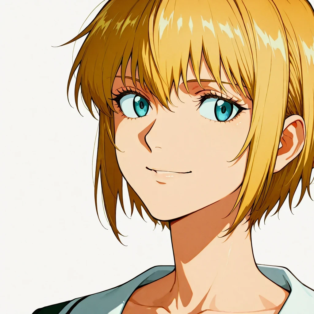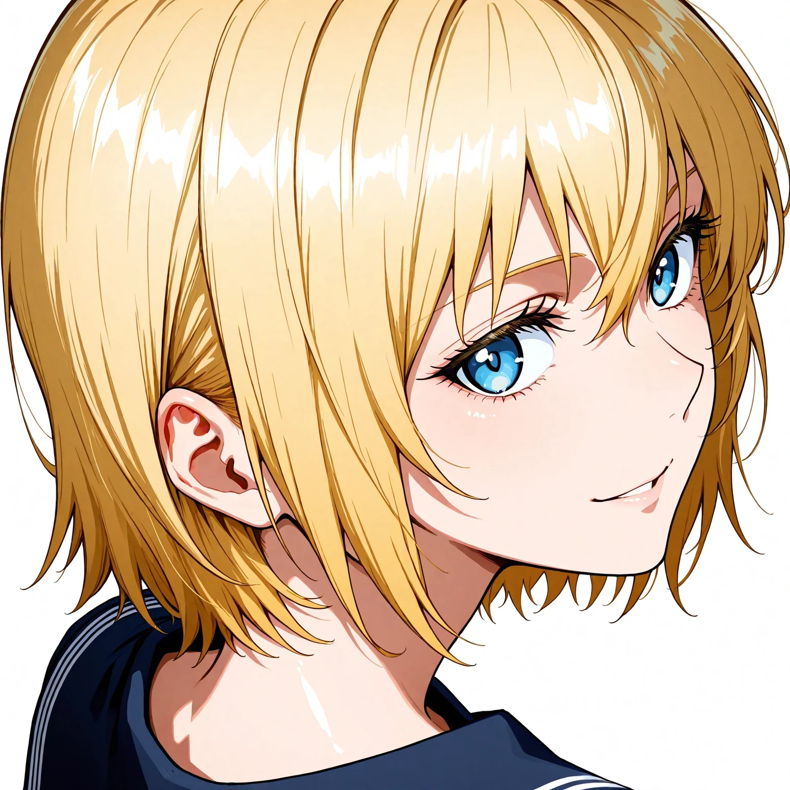 Bebebe, 1girl, solo, blue eyes, blond hair, short hair,