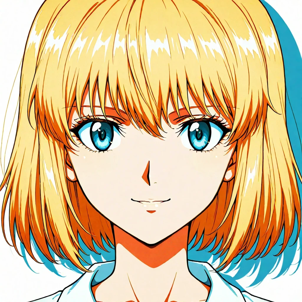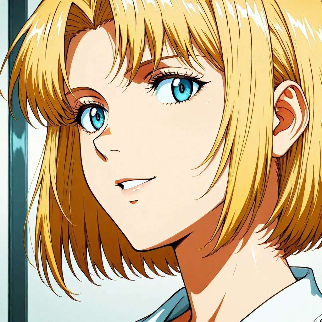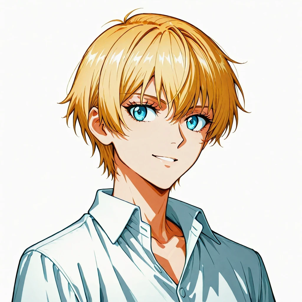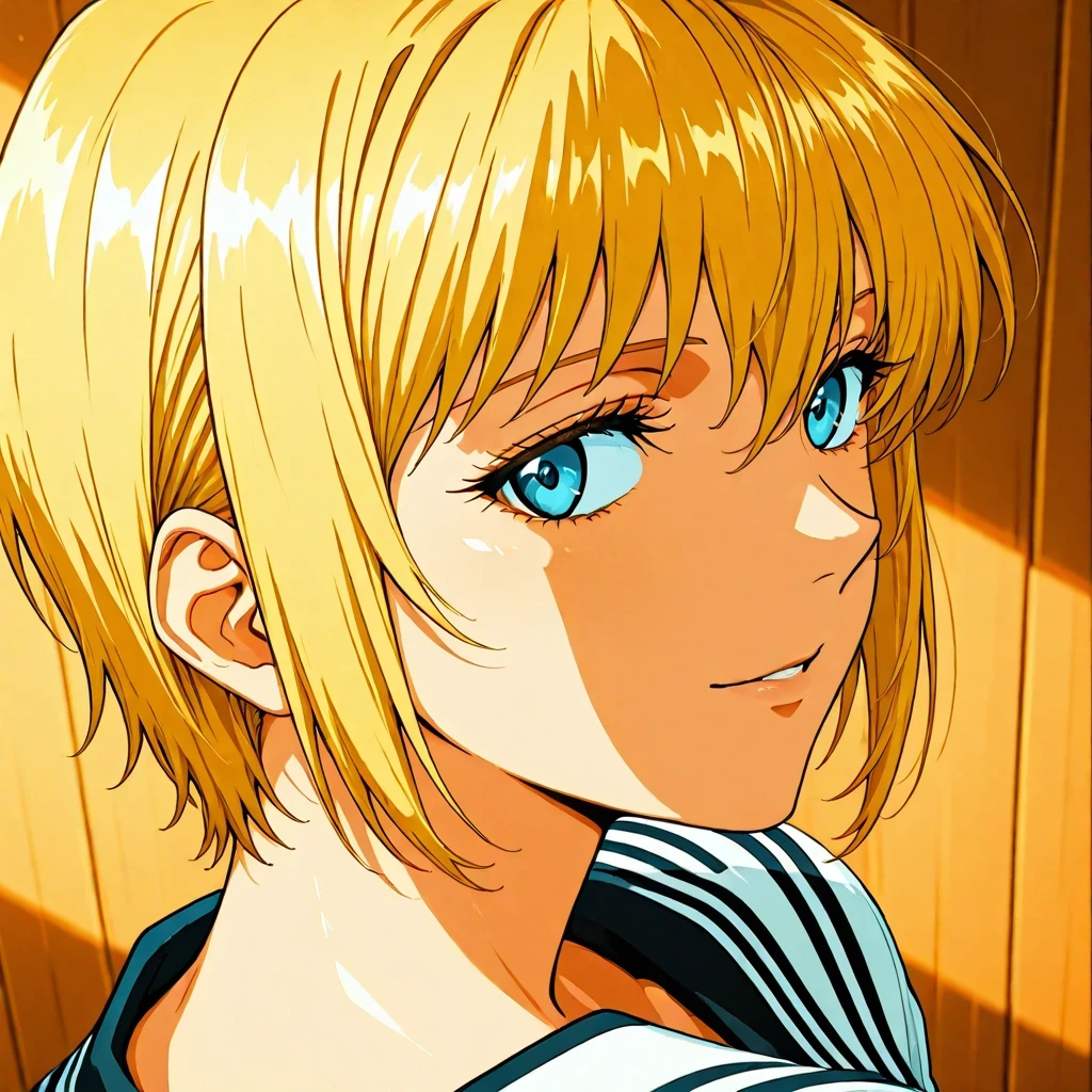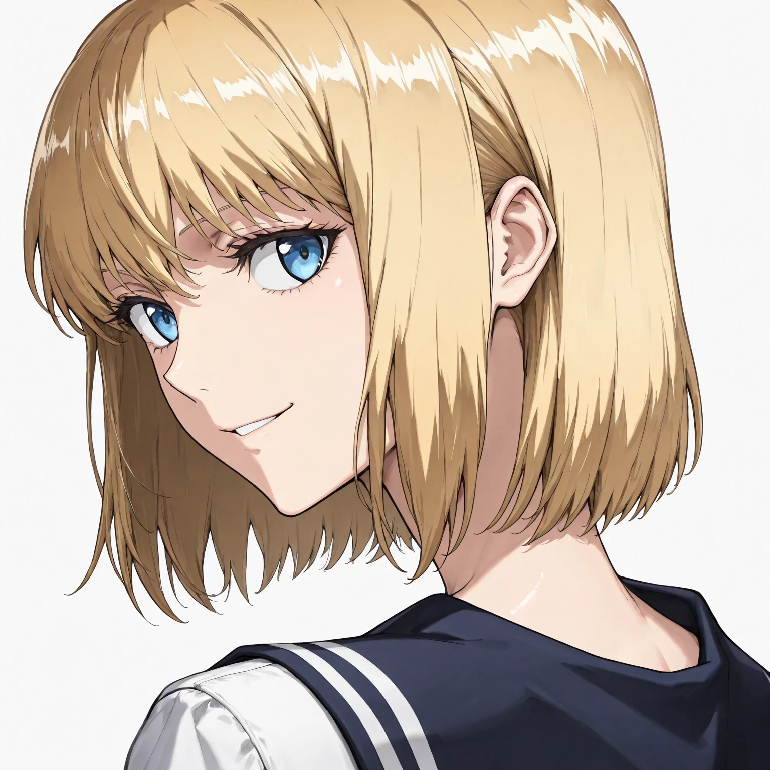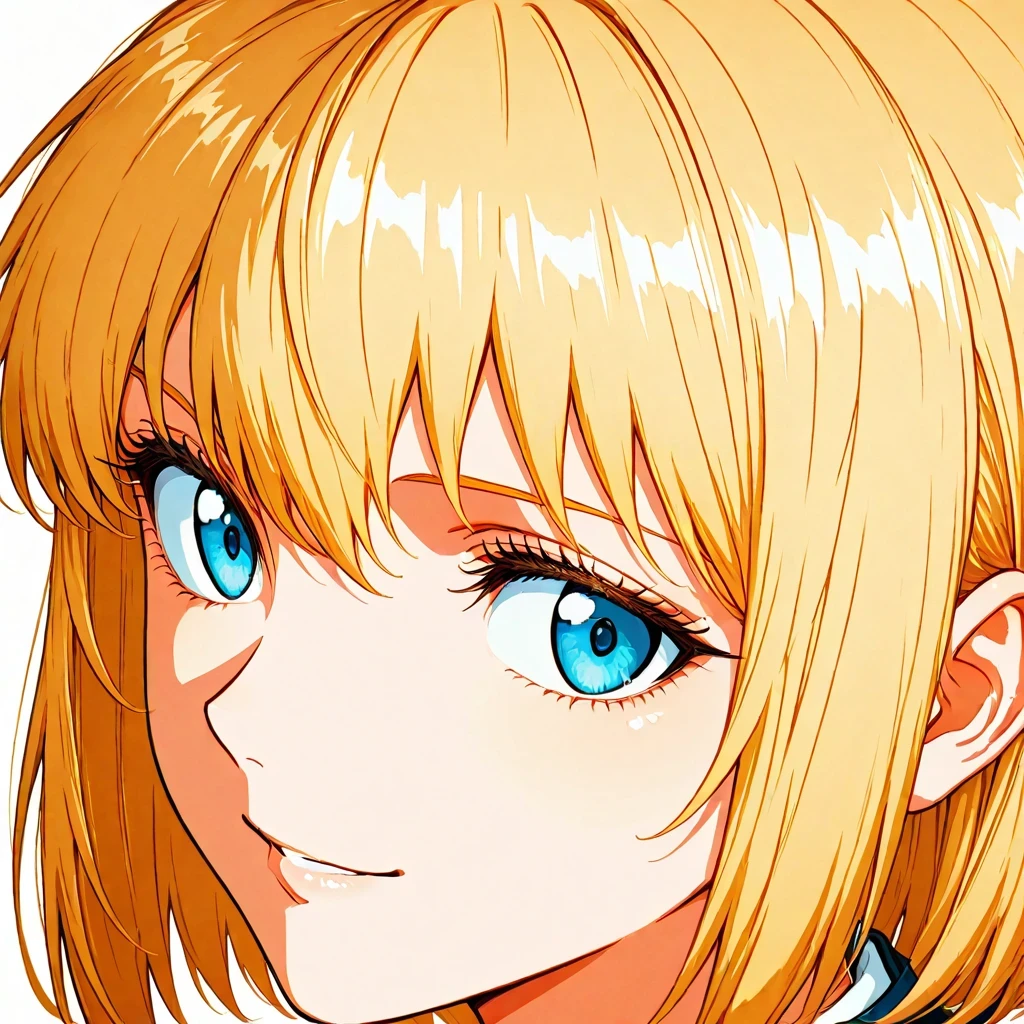 Bebebe, 1girl, solo, blue eyes, blond hair, short hair,