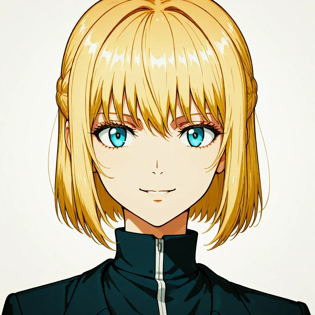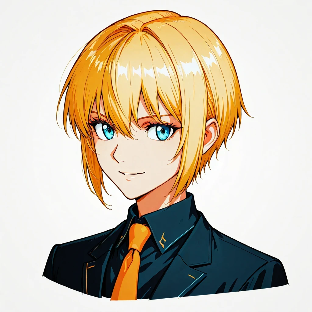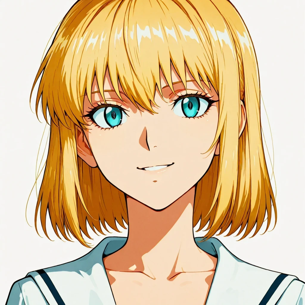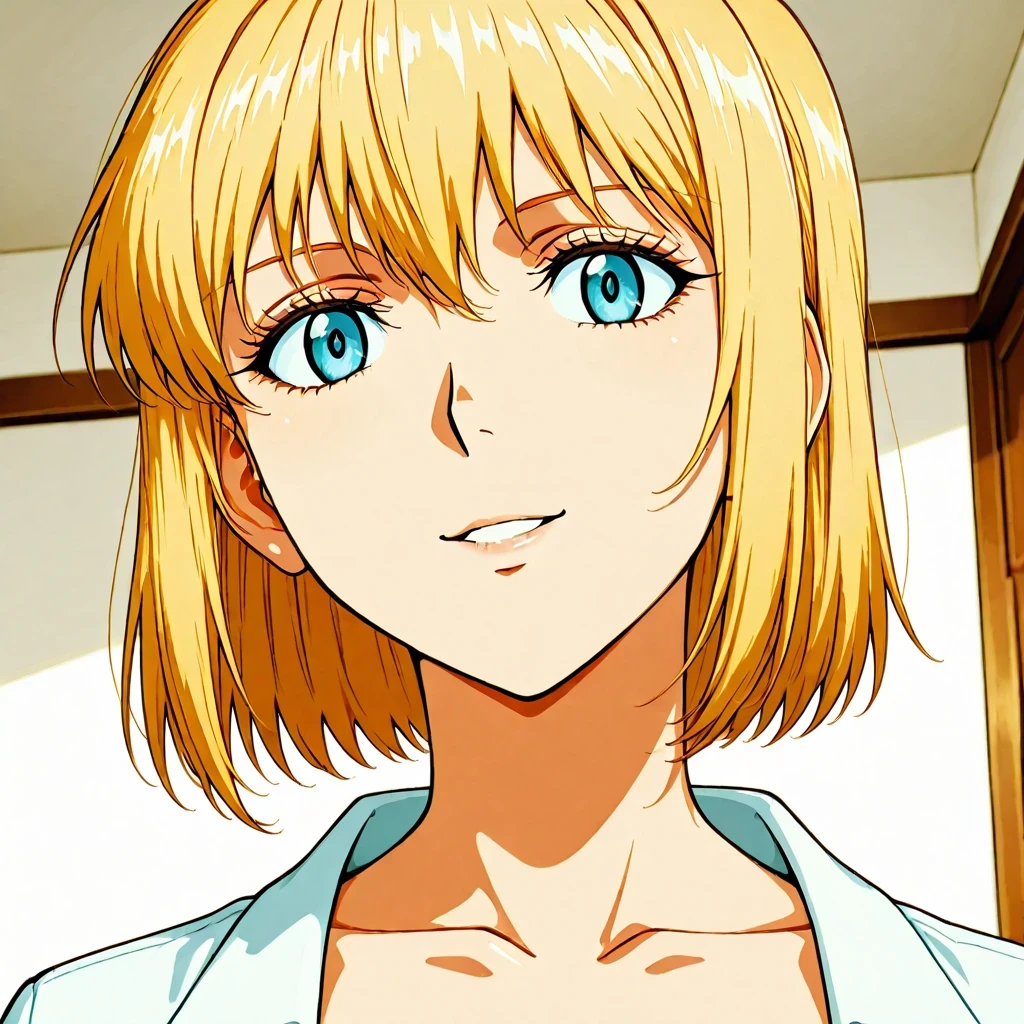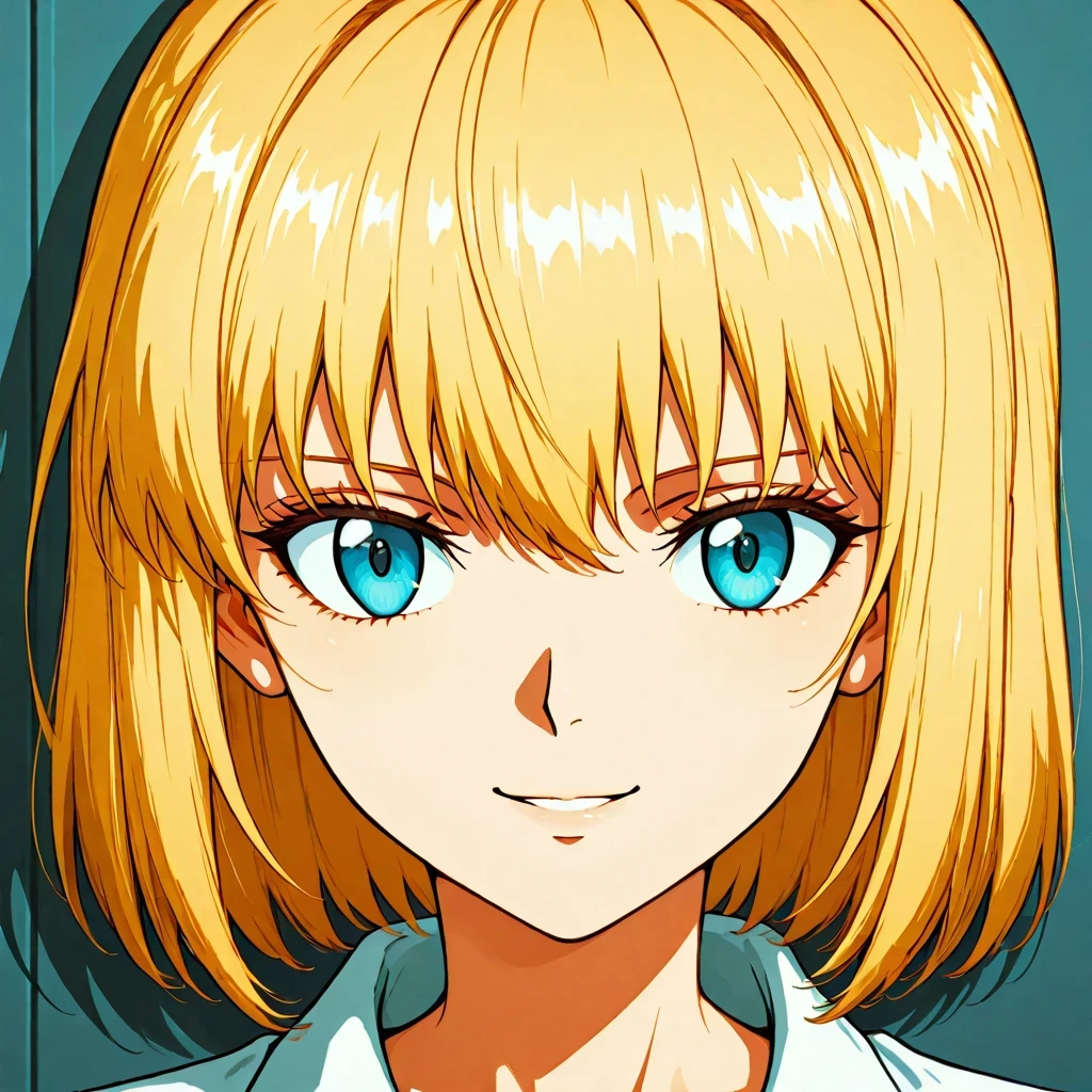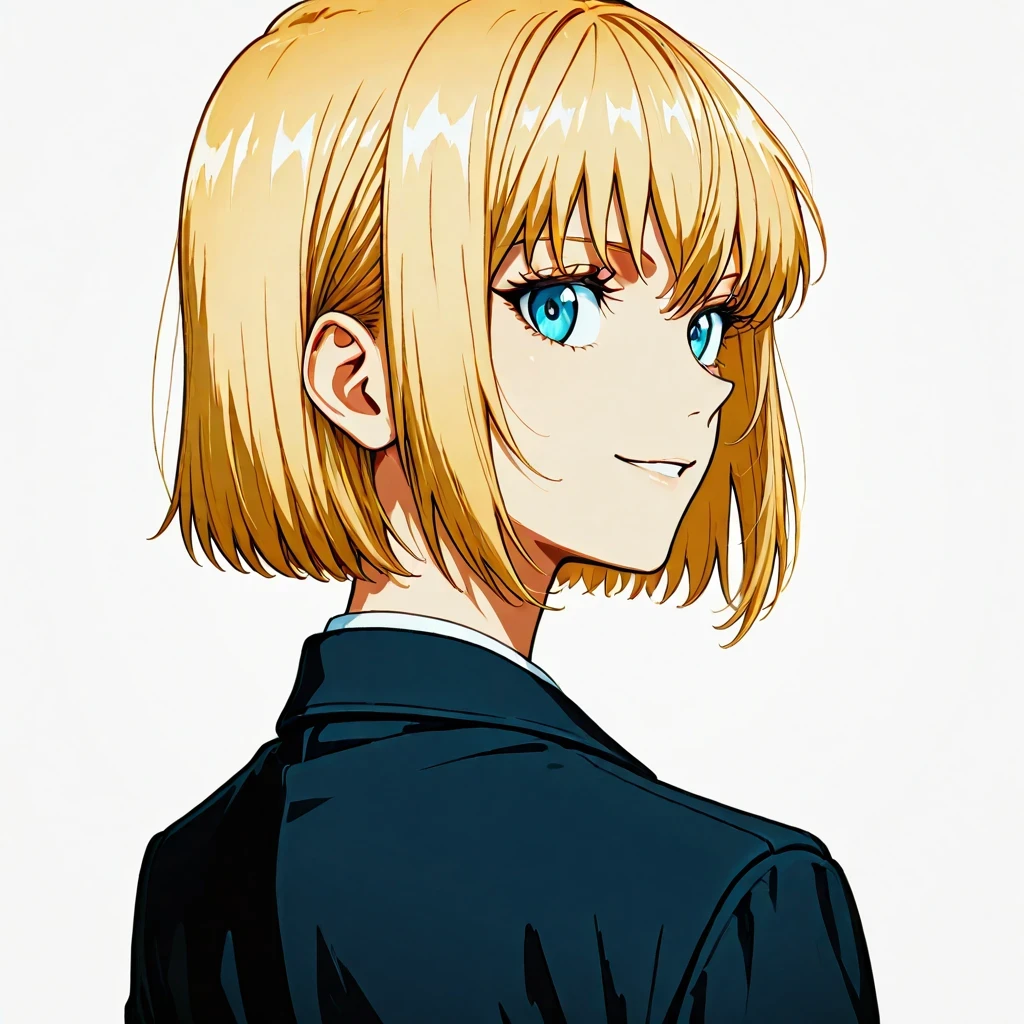 Bebebe, 1girl, solo, blue eyes, blond hair, short hair,