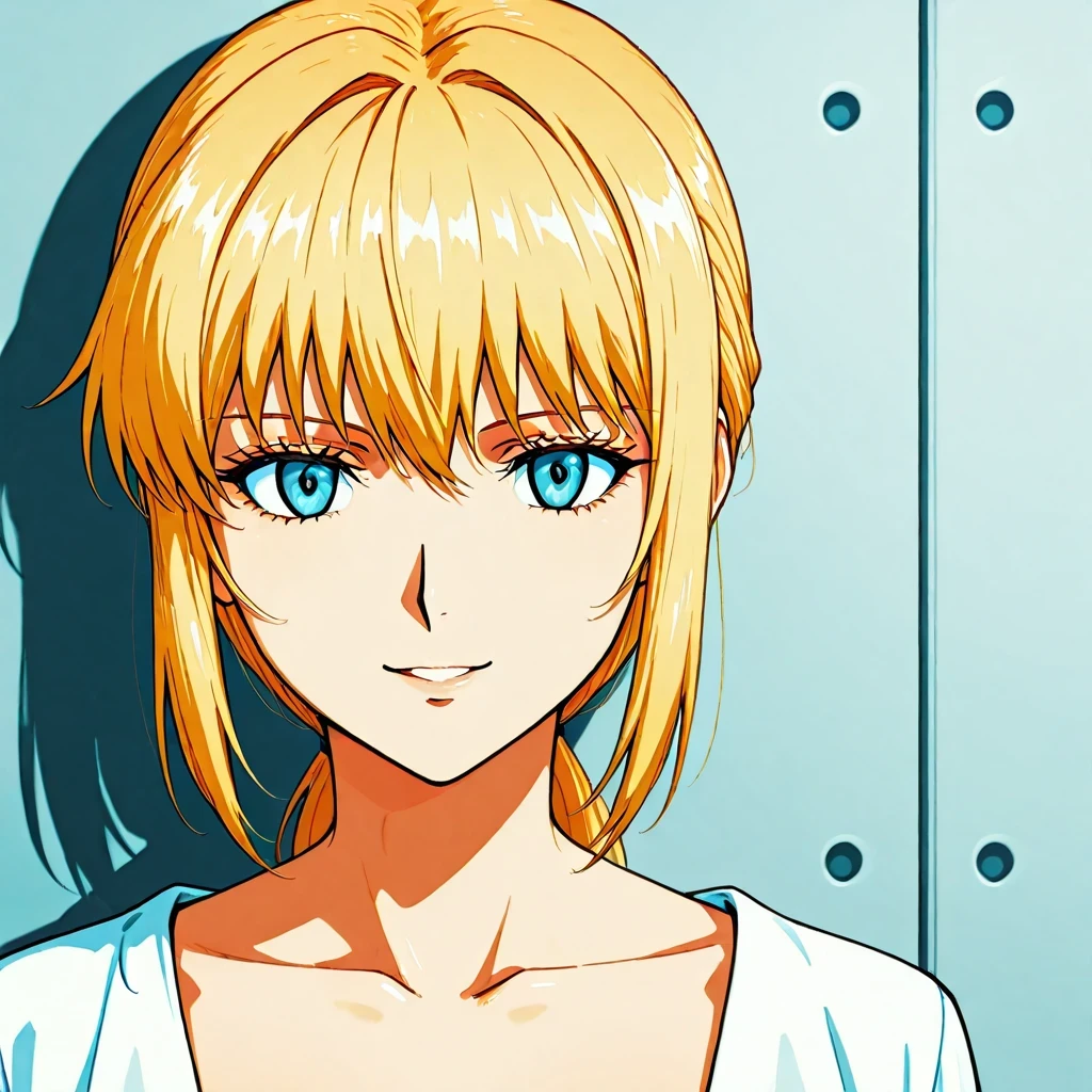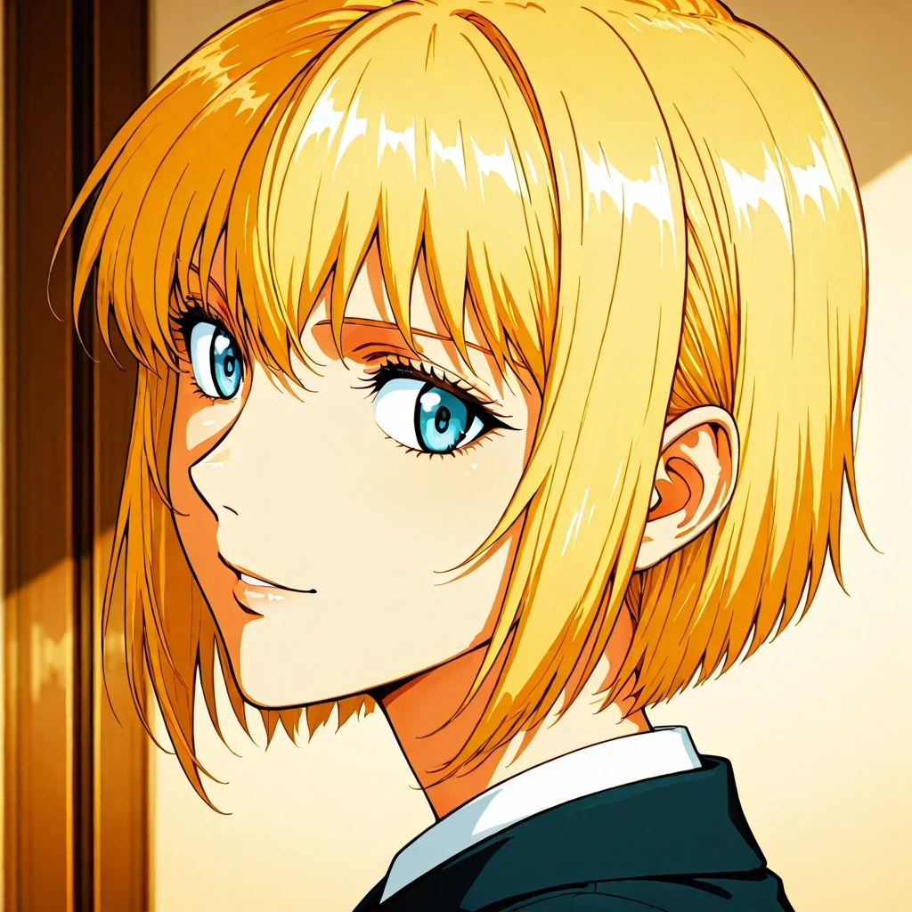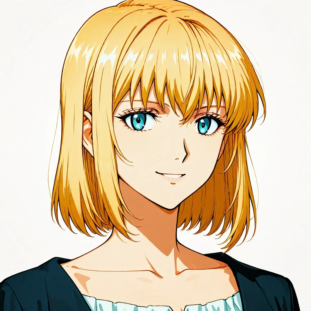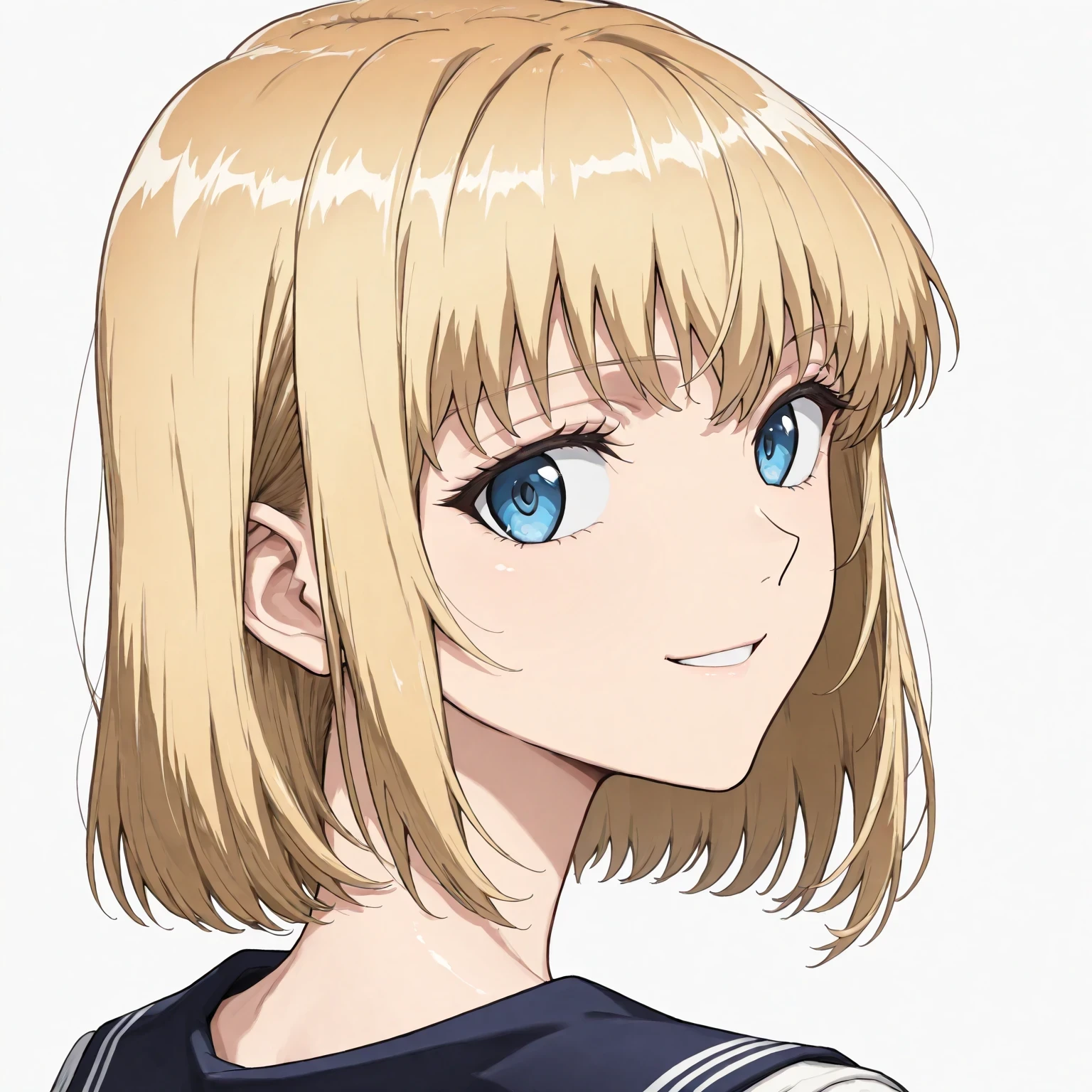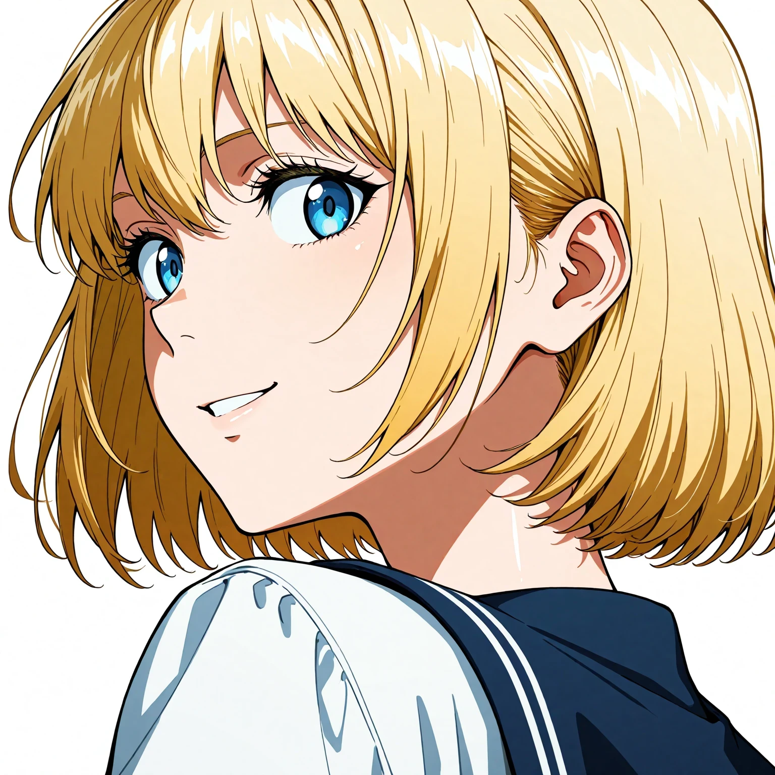 Bebebe, 1girl, solo, blue eyes, blond hair, short hair,