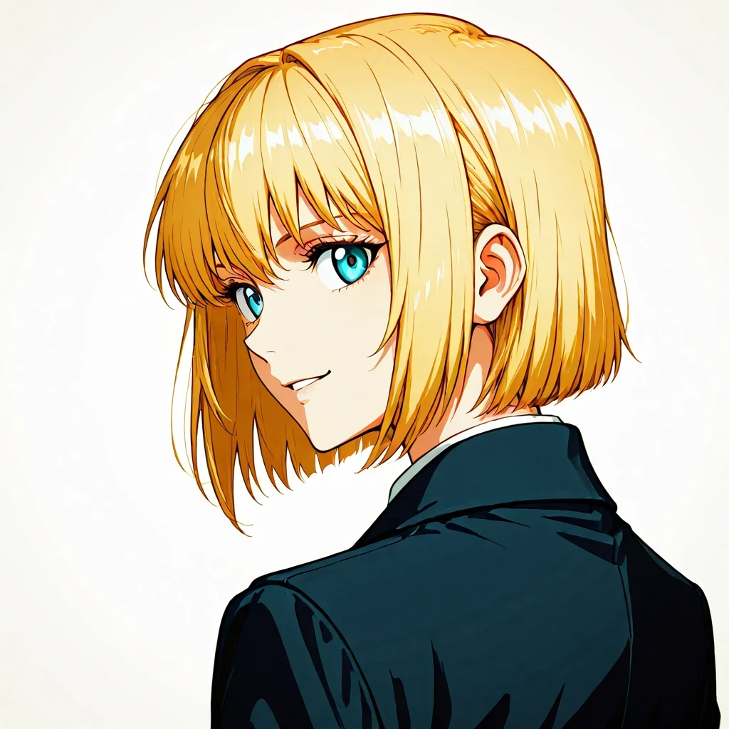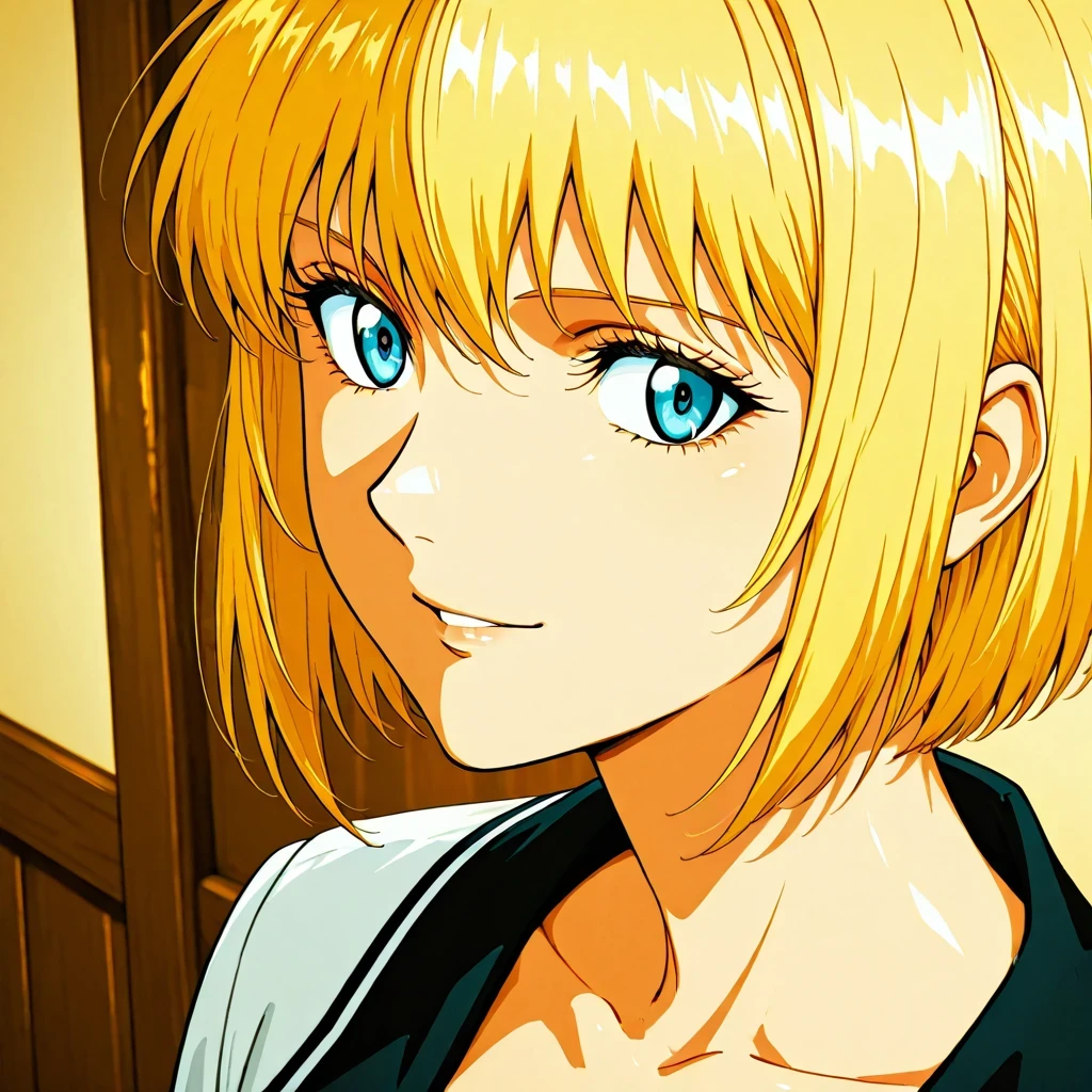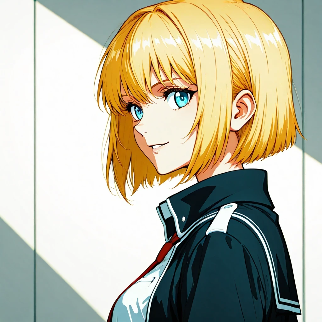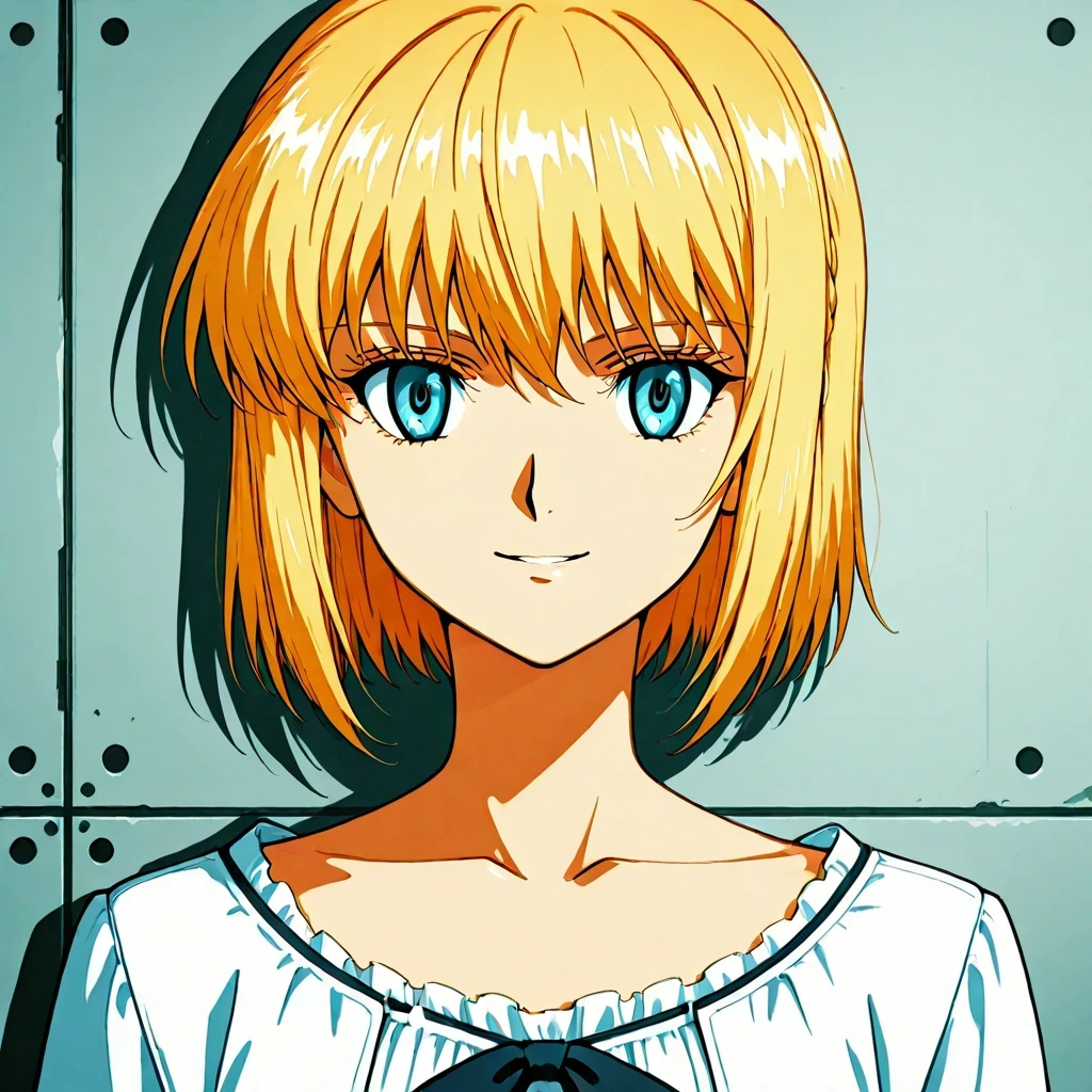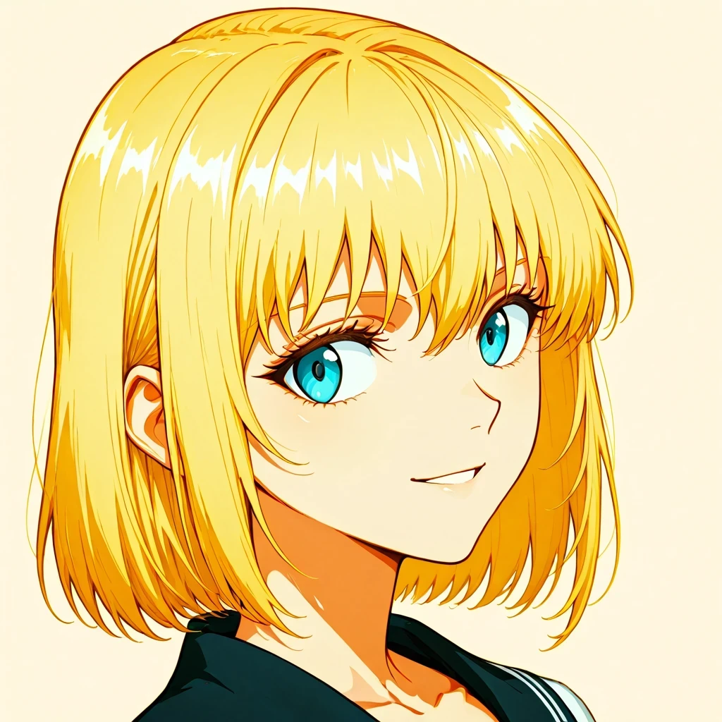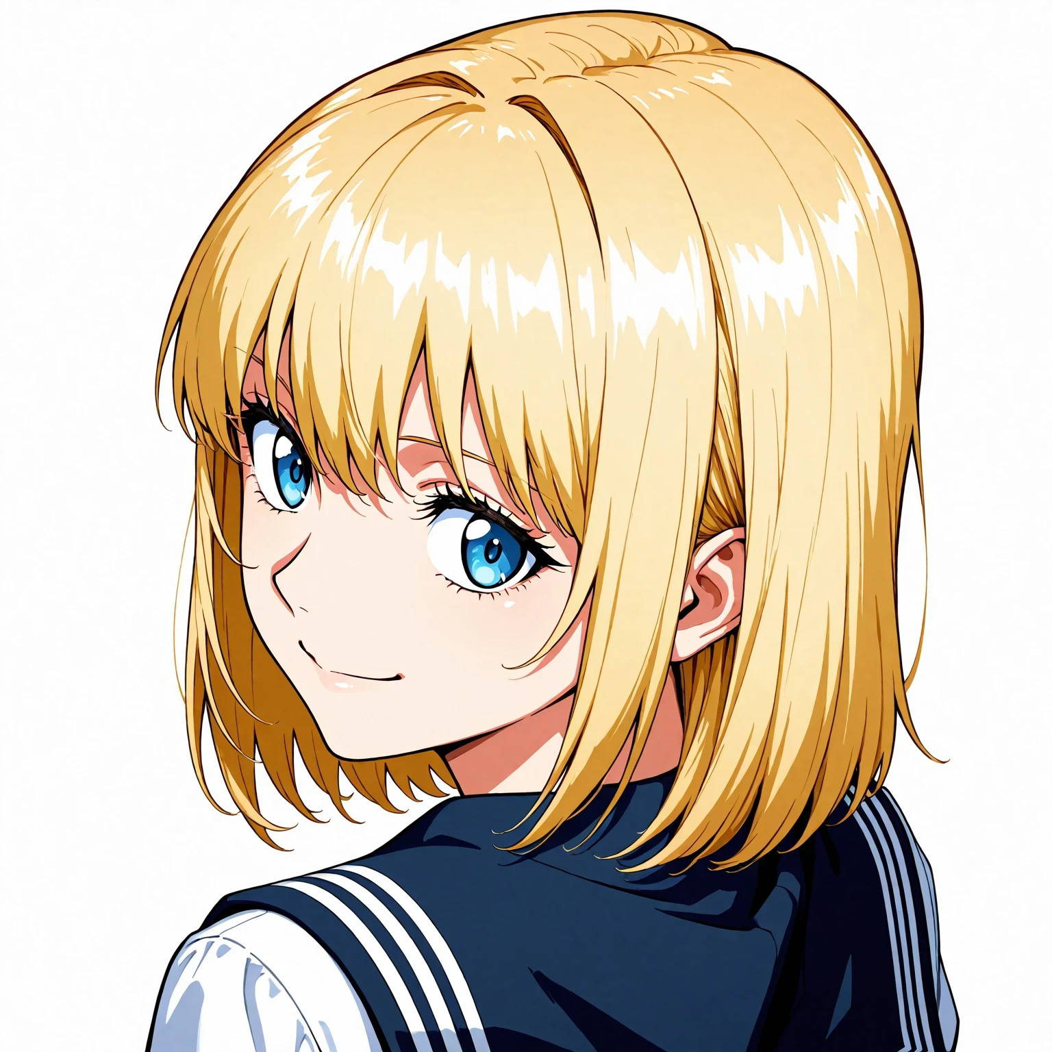 Bebebe, 1girl, solo, blue eyes, blond hair, short hair,