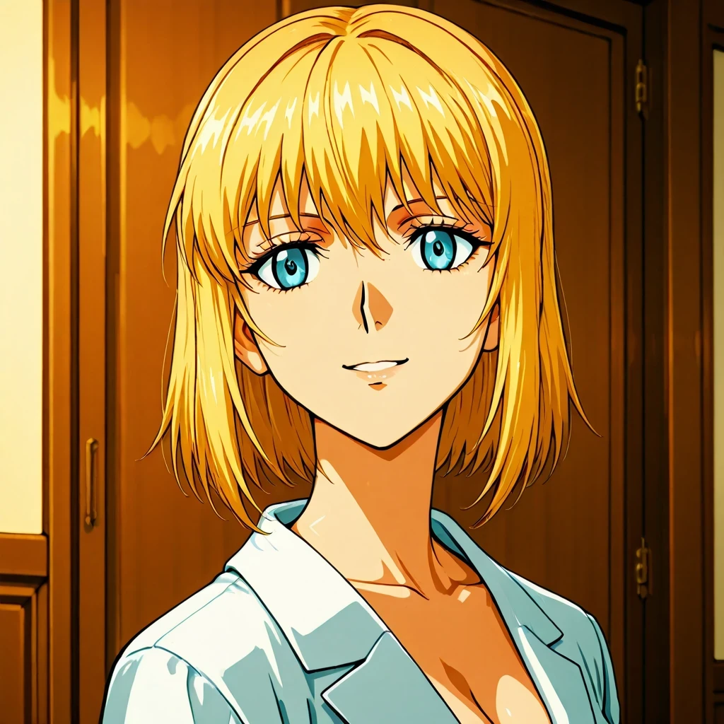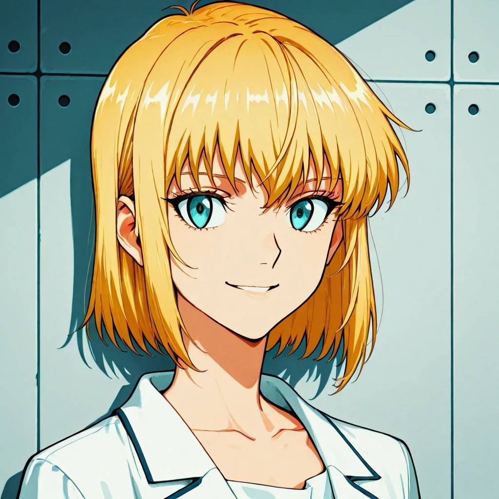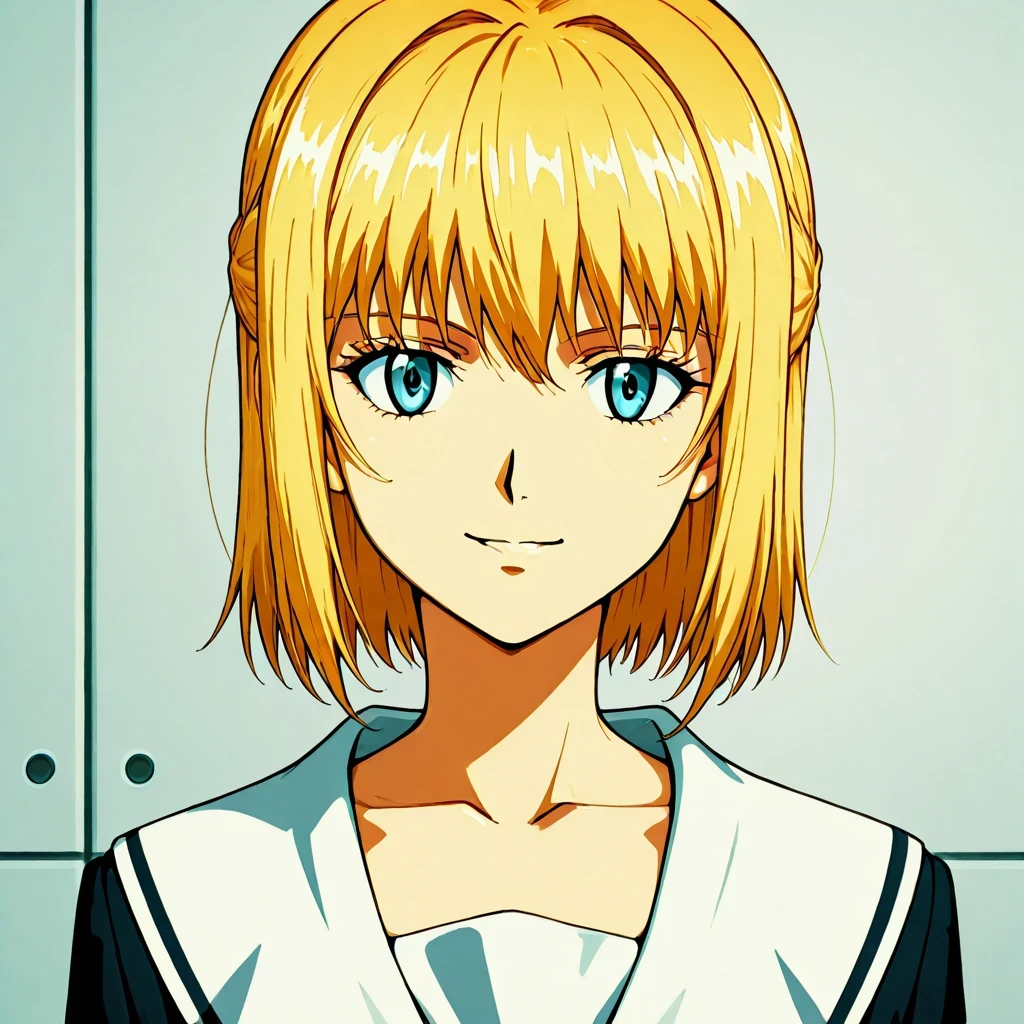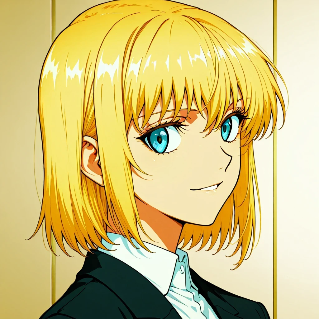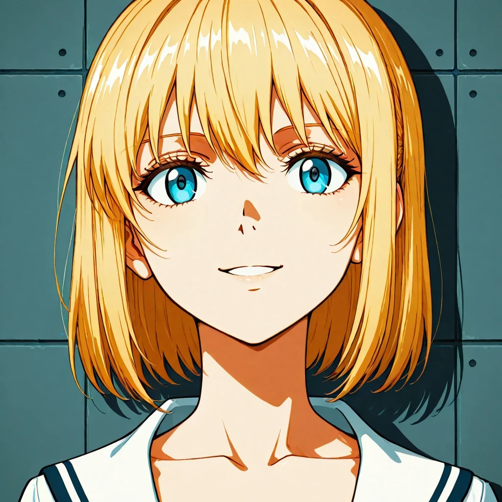 Bebebe, 1girl, solo, blue eyes, blond hair, short hair,