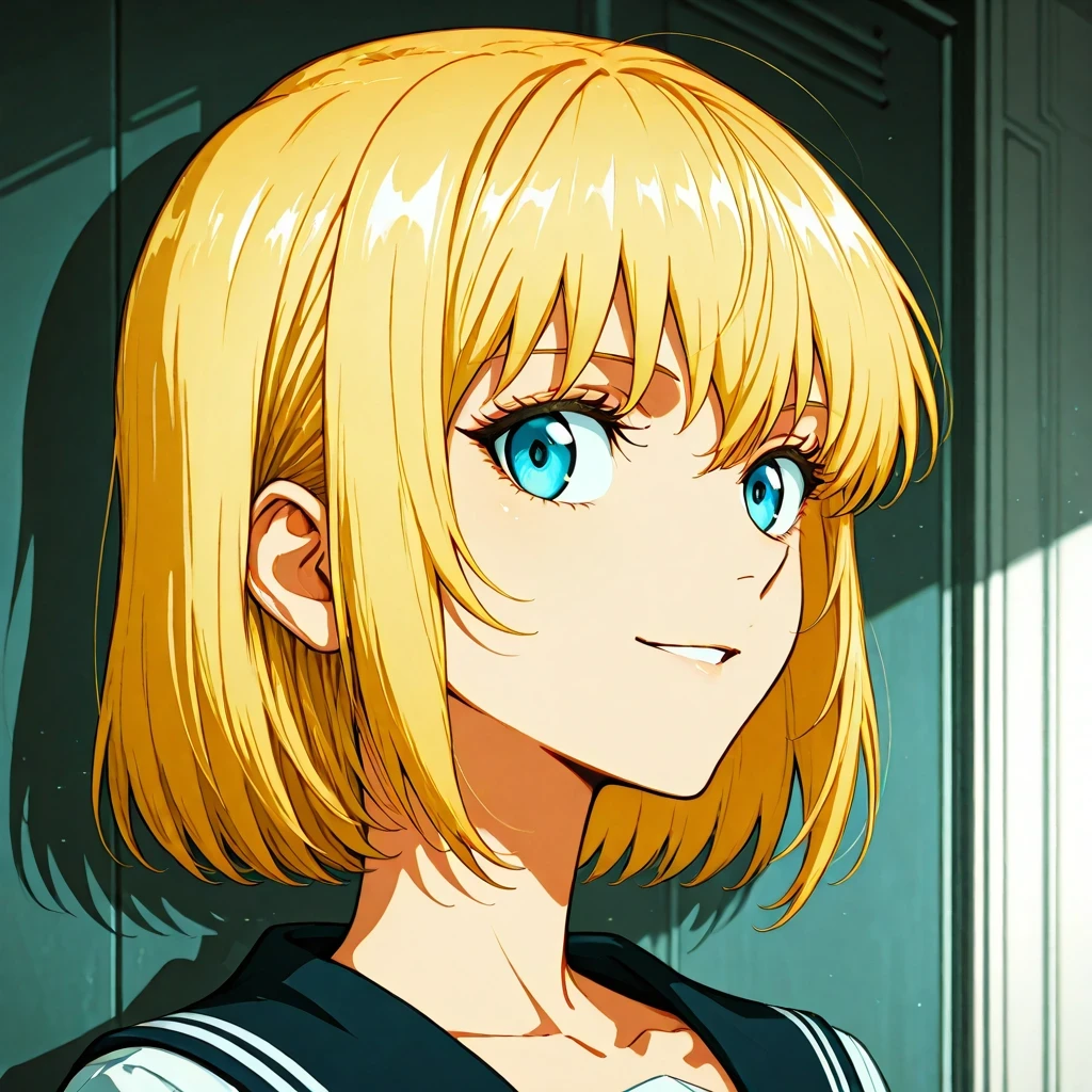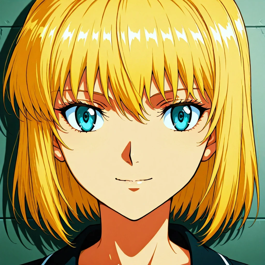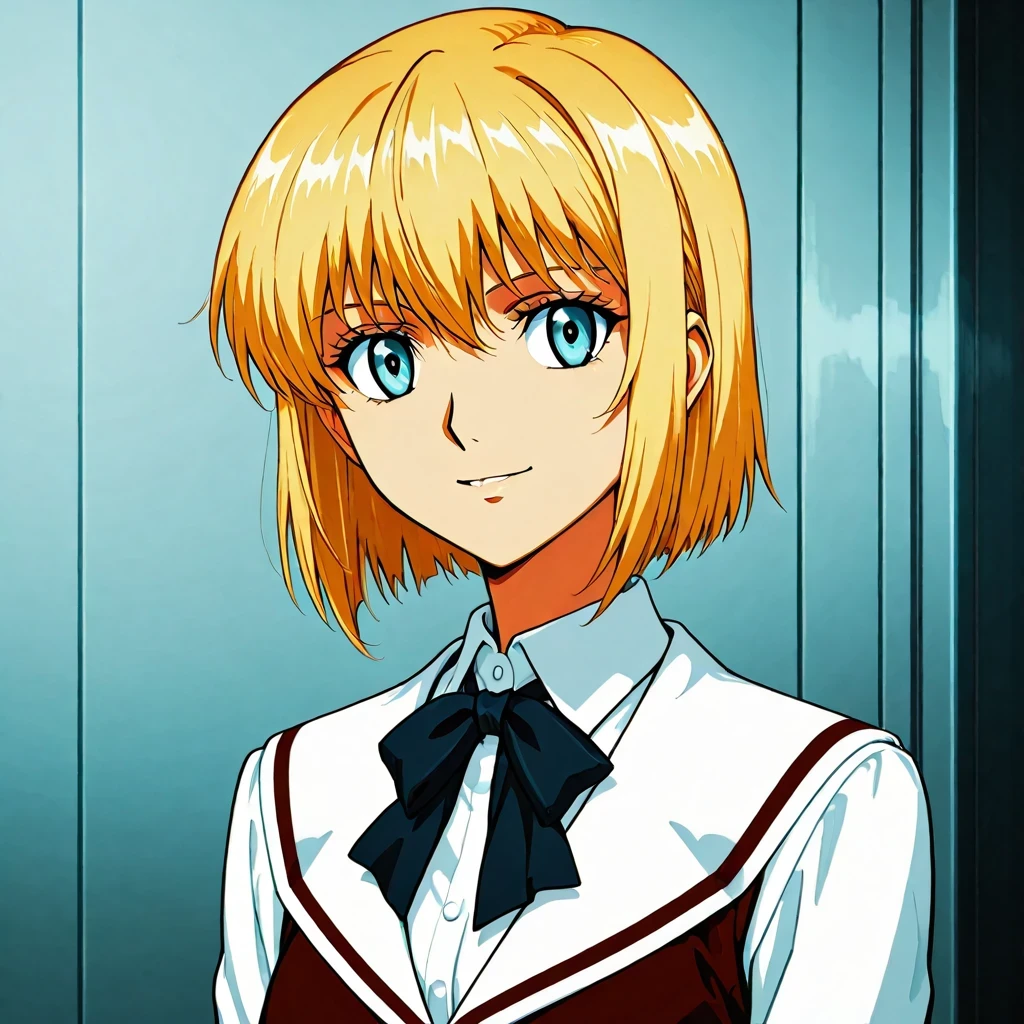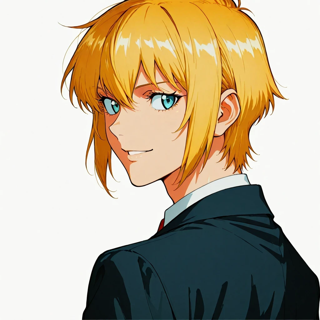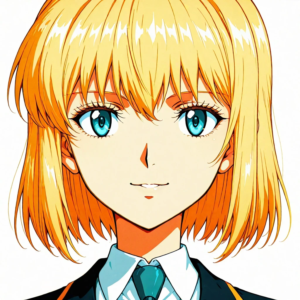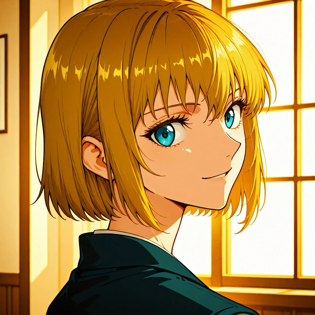 Bebebe, 1girl, solo, blue eyes, blond hair, short hair,