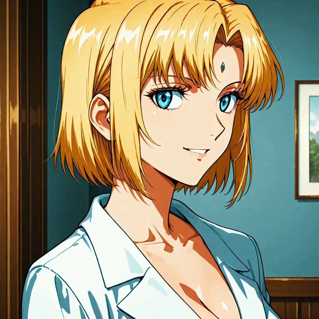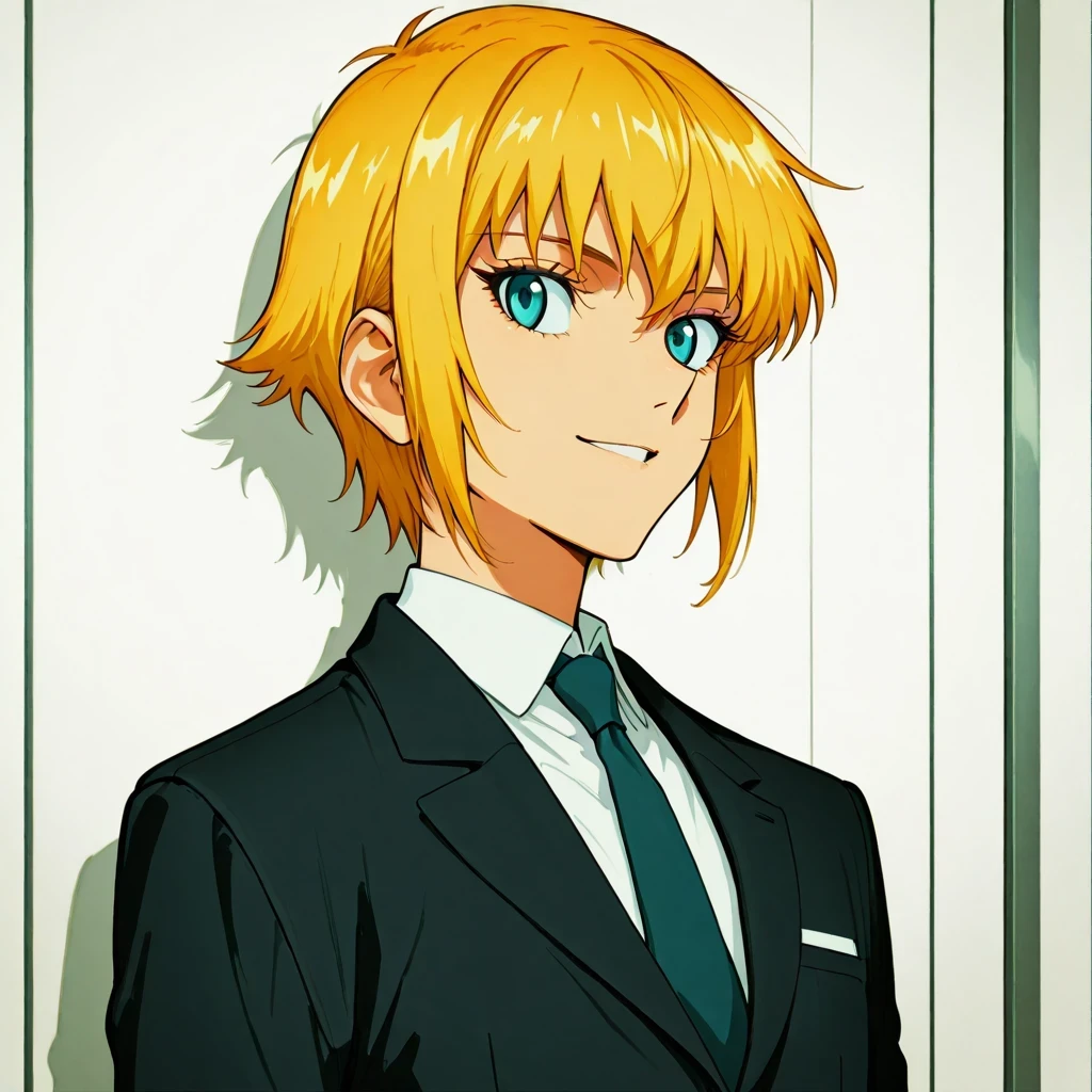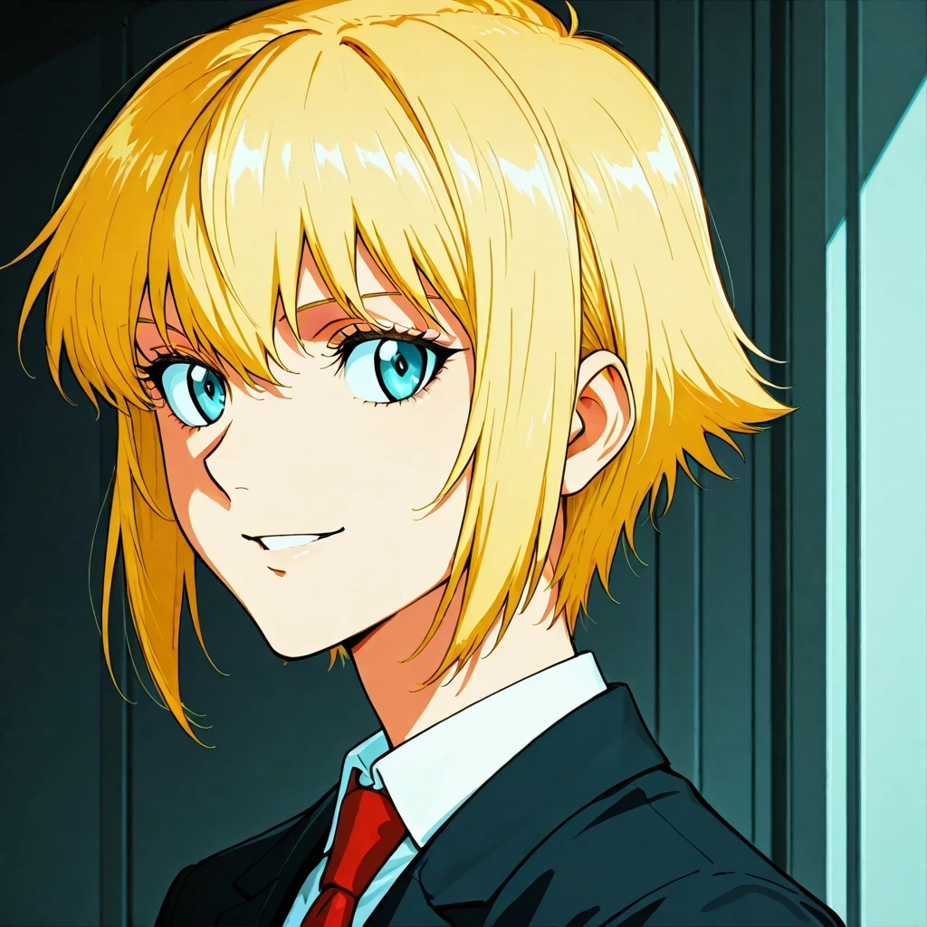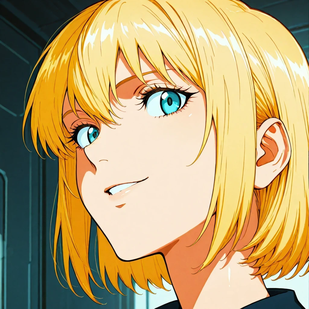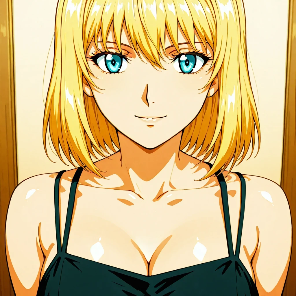 Bebebe, 1girl, solo, blue eyes, blond hair, short hair,