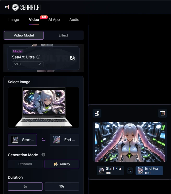 SeaArt Ultra を使用する一番のメリットは、動画の開始フレームと終了フレームを指定できるため、複数の生成済み動画を繋いだ際に比較的自然な演出を表現できて、余分な編集の手間が省けるからです。( これが俗に言われる「A to B」と呼ばれる生成法です。)
