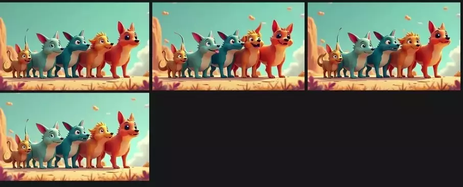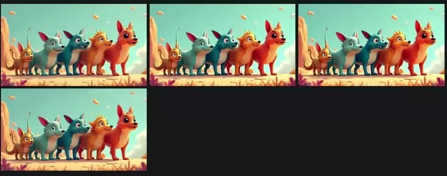 The rightmost orange dog energetically waves a front paw, leaving a trail of sparkling light in the air.