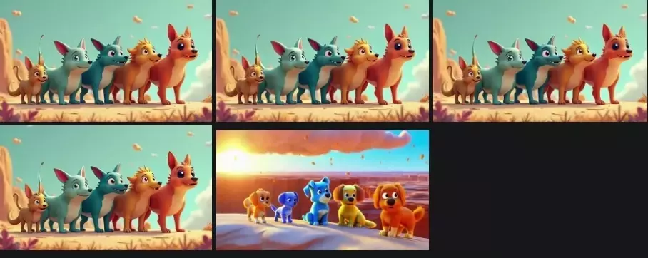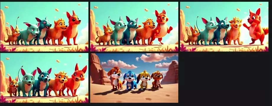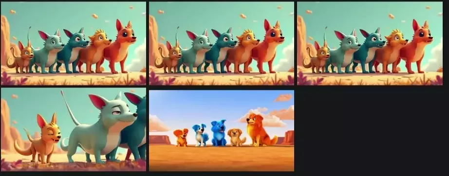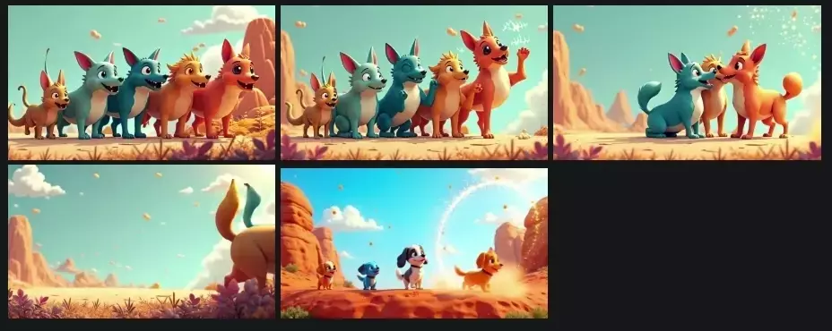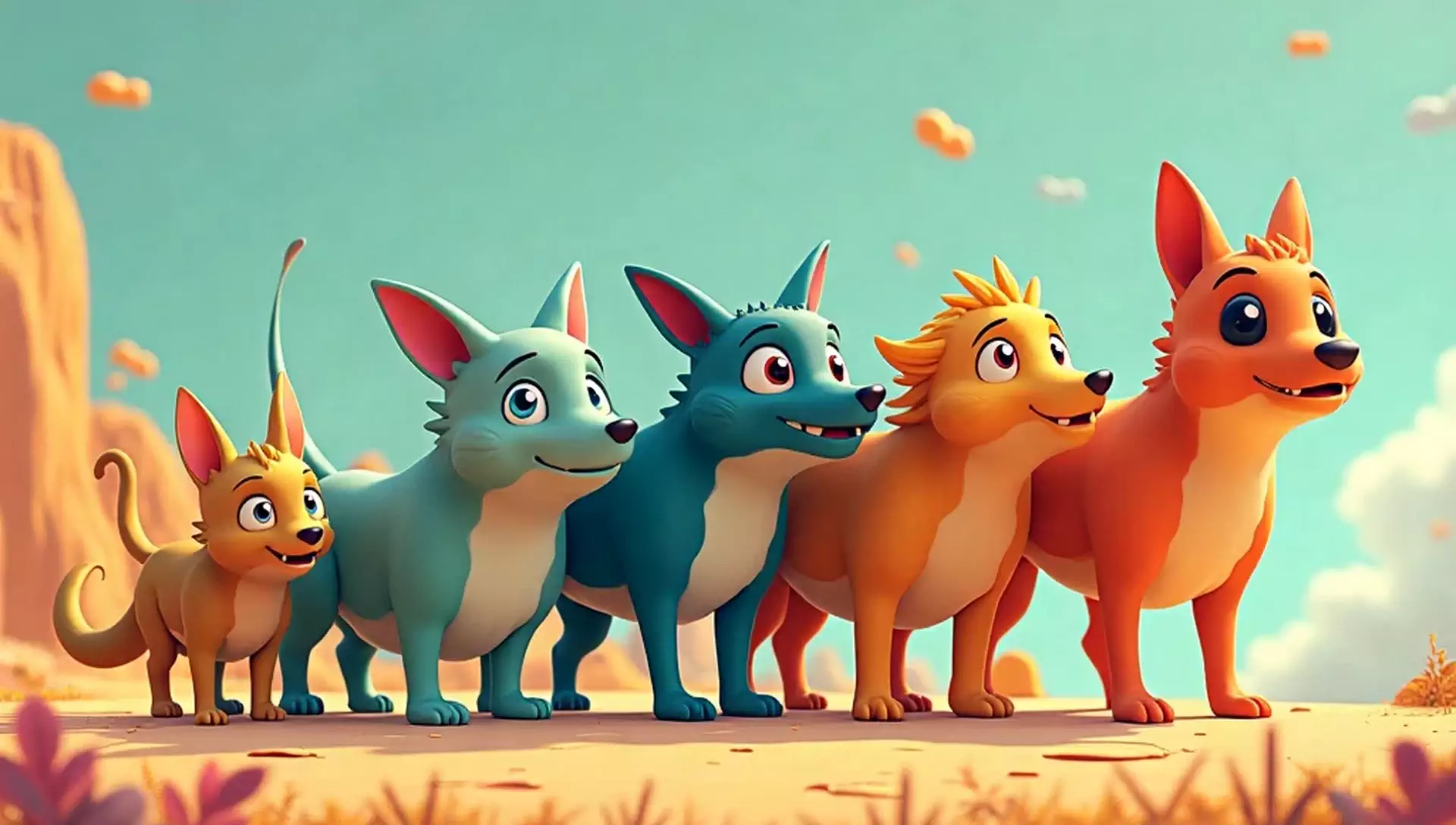 [High-quality, cheerful and lively 3D animation (Disney or Pixar style) with exaggerated movements. Five colorful anthro dogs stand in a line on a sun-drenched desert cliff. The sky is bright blue with fluffy orange clouds floating lazily. Beyond, orange rock formations rise. Sunlight creates warm tones and natural shadows across the sandy ground.