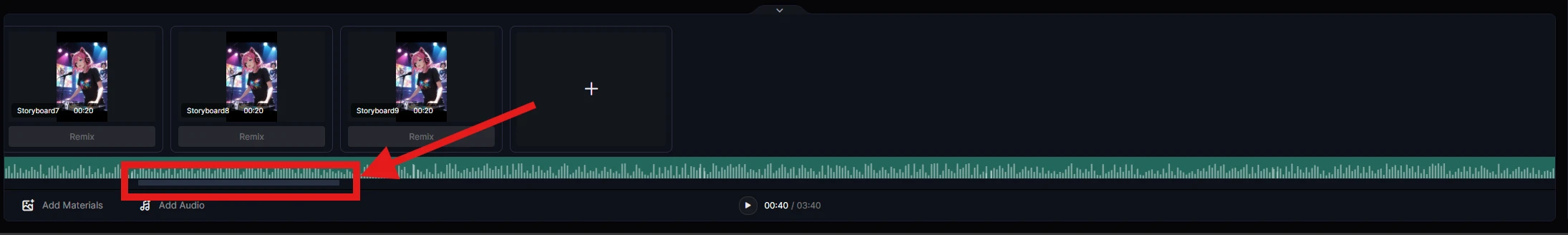 コンテの量や音楽の追加で全体の時間が増えていくと、全て表示しきれなくなりますので、その際は音声の下にあるスライドバーを使用して表示位置を適宜変更して、編集していきます。